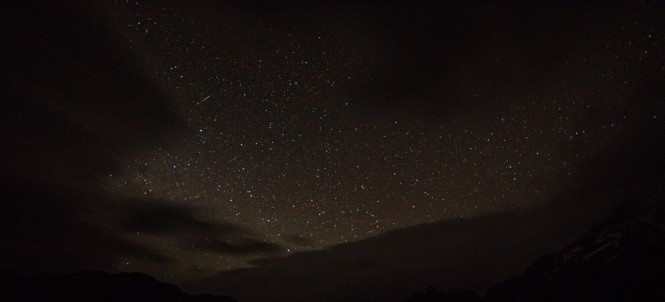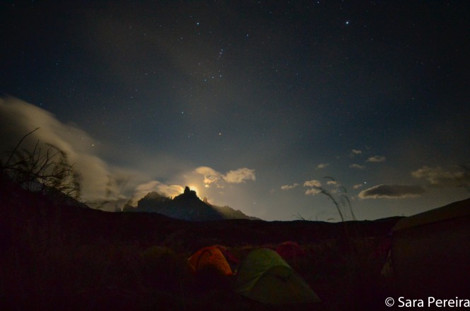 Após a descida do Vale Francês peguei minha mochila e fui para o acampamento Cuernos (infelizmente não se pode dormir mais de uma noite nos acampamentos adiministrados pelo CONAF). O acampamento Cuernos, para mim, foi o pior que todos, muito desorganizado, sujo e instalações a desejar. Mais uma vez acordei no meio da madrugada, não pelo vento, mas sim pela ausência dele. Depois que escureceu começou uma ventania absurda (mais uma vez minha barraca aguentou bem), porém lá pelas 2-3 da madrugada estava uma paz, nada de vento. Tirei mais algumas fotos noturnas (a lente não ajuda muito), mas é incrível ver aquele céu (esse sim com mais estrelas) e até tive a sorte de avistar um meteoro, consegui pegar ele na foto.