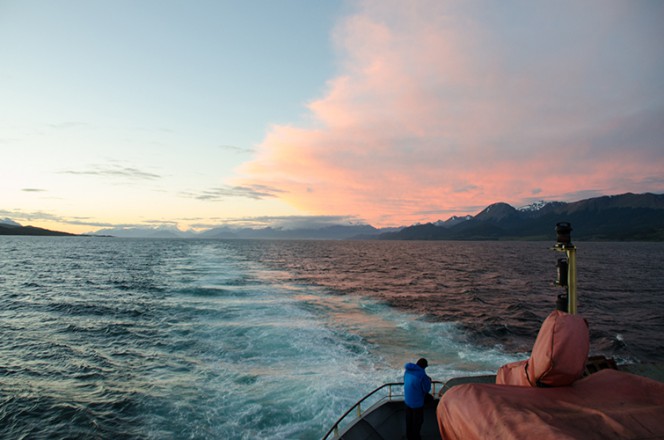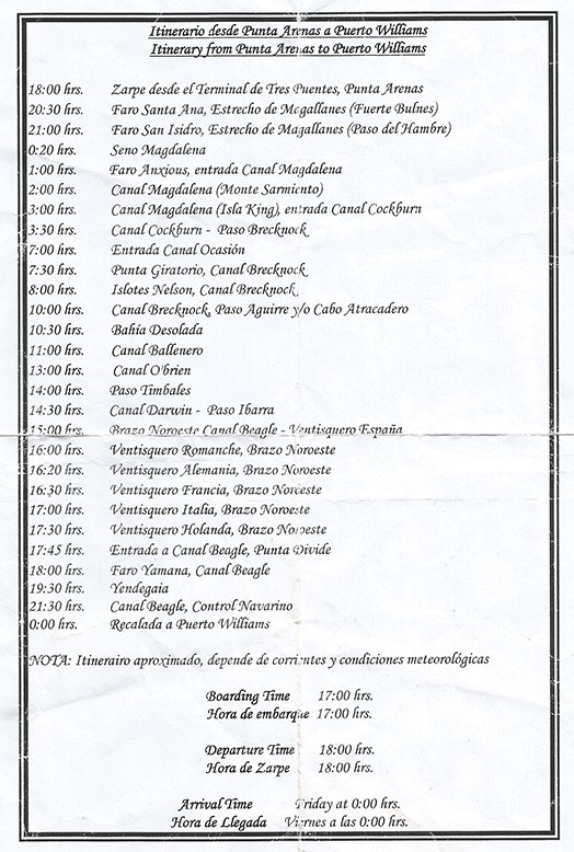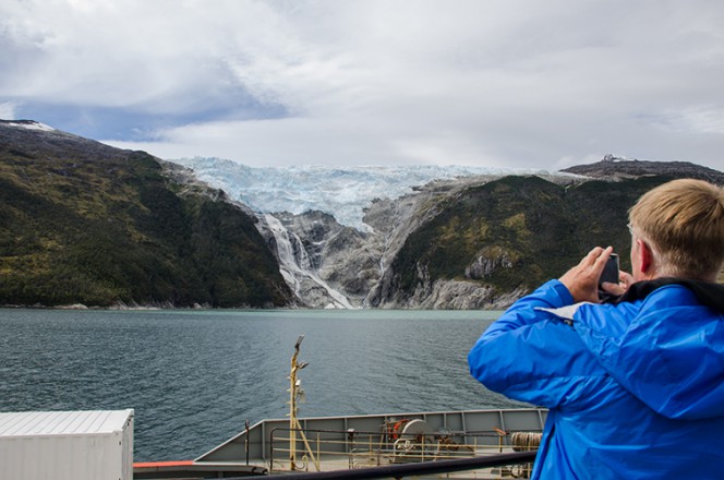 É uma viagem espetacular de 30h (sim, TRINTA horas), passando por entre os tortuosos canais e ilhotas chilenas e dá pra ver focas e golfinhos acompanhando o navio esporadicamente, uma vez que acesso ao convés é livre a qualquer hora. Recomendo pelo menos o trajeto de ida, na volta você vai passar pelas geleiras tarde da noite e não vai ver muita coisa. Recebi uma relação de pontos de interesse quando retirei minha passagem em Punta Arenas, com o horário estimado de passagem por eles. O barco parou no Ventisquero Italia por uns 15 minutos, deu pra tirar muitas fotos que não fazem jus à imponência e a beleza da massa de gelo:
