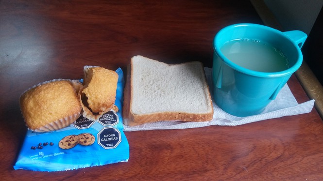 Café da manhã: 2 mini muffins, um pacote de cookies, um misto frio e suco
