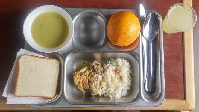 Almoço: Arroz, frango ensopado, sopa, pão, laranja e suco