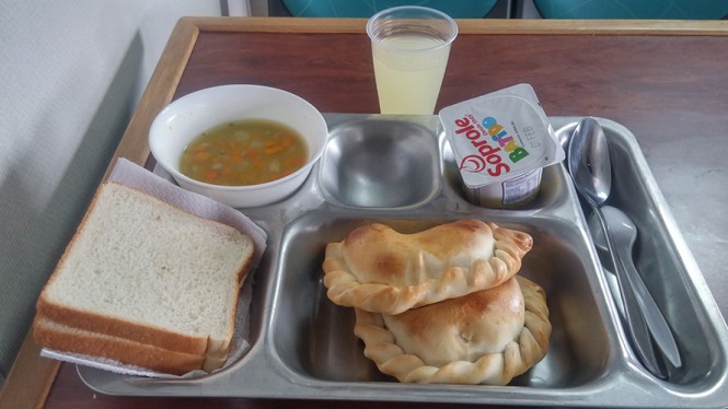 Jantar: Empanadas, pão, sopa, iogurte e suco