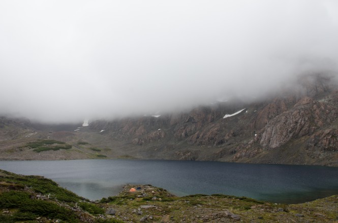 Então. Pra começar: saí de casa com a barraca errada. No meio desse planejamento da viagem, tinha esquecido da barraca, atualmente só tenho uma de quatro estações de parede única. E daí? Quatro estações deve aguentar primavera, verão, outono, inverno, certo? Errado. Não sei quem foi o energúmeno que inventou essa denominação, mas as quatro estações de uma barraca desse tipo são: frio, neve, vento e altitude (?). O pessoal mais experiente sabe que barracas de parede única, em tempo úmido (e chuvoso, vai), condensam por dentro por causa da diferença de temperatura. E descobri que o saco de dormir também condensa! E isolantes infláveis também condensam por entre as ranhuras! Enfim, quando percebi era tarde demais e acabei indo com ela mesmo. Já meio que sabia o risco que corria (crianças, não tentem repetir). A noite na Laguna del Salto foi tranquila, só teve um pouco de umidade. Na Laguna Escondida choveu bastante. Imaginem a minha alegria de acordar com a barraca toda empoçada, saco de dormir úmido (com recheio de pena, imaginem a merd* que ficou), tendo que empilhar e ajeitar as coisas pra não molhar mais ainda. Saí com o dia nublado e não tive como secar nada. Baseado nisso, resolvi tentar maximizar o tempo de trilha, tentando caminhar o máximo possível pra tentar cortar talvez um dia. Às vezes as nuvens davam uma brecha e mostravam um projeto de sol durante a manhã.