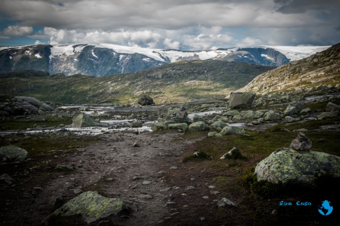 Outros indicativos do caminho são os tradicionais totens presente em diversas regiões de travessias e a letra “T” pintada de vermelho nas rochas. Superados os 4 quilômetros iniciais, que tem uma variação vertical de aproximadamente 800m, a trilha fica bem tranquila. Praticamente plana e com um visual espetacular permitindo diversas fotografias de landscape. A cada Km uma placa indica a distância do estacionamento e a distância do trolltunga.