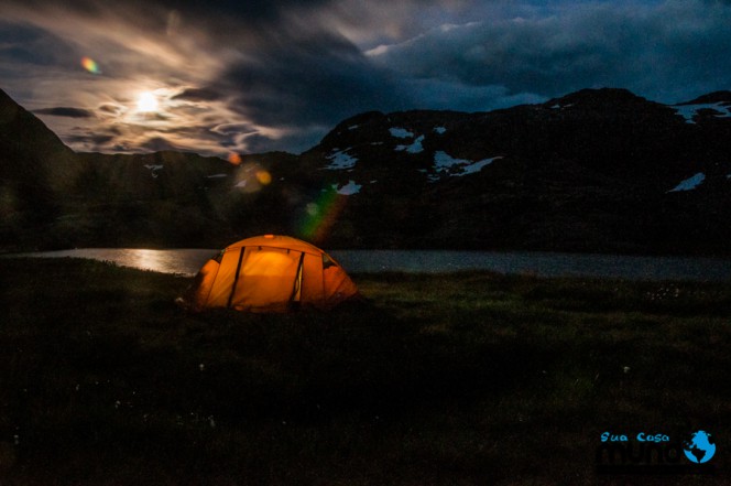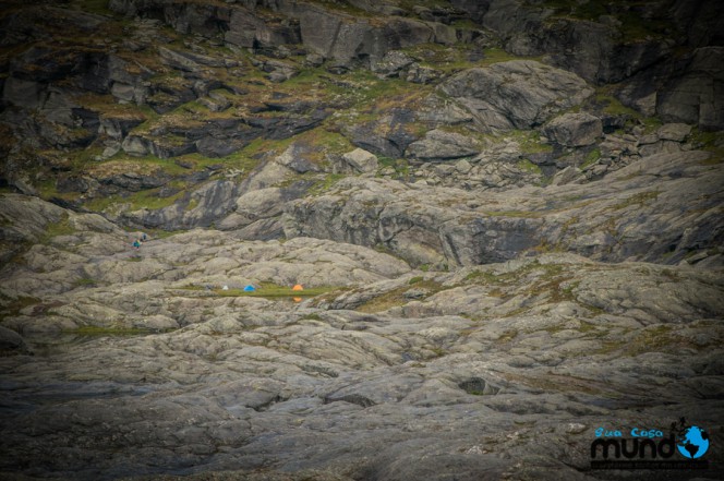 É uma caminhada tranquila, ora passando por lajes de pedra, ora por trilhas de terra batida. Cruzamos com diversas pessoas que faziam o caminho inverso, descendo. Não há necessidade de guias. Na verdade é bem difícil se perder por ali. O caminho vai margeando o fjorde. Após algumas horas de caminhada e a cerca de 1,5 km de distância da famosa pedra encontramos um local ideal para o camping. Ali mesmo armamos nossas barracas num grande platô gramado, às margens de um laguinho, protegido do vento por um paredão rochoso.