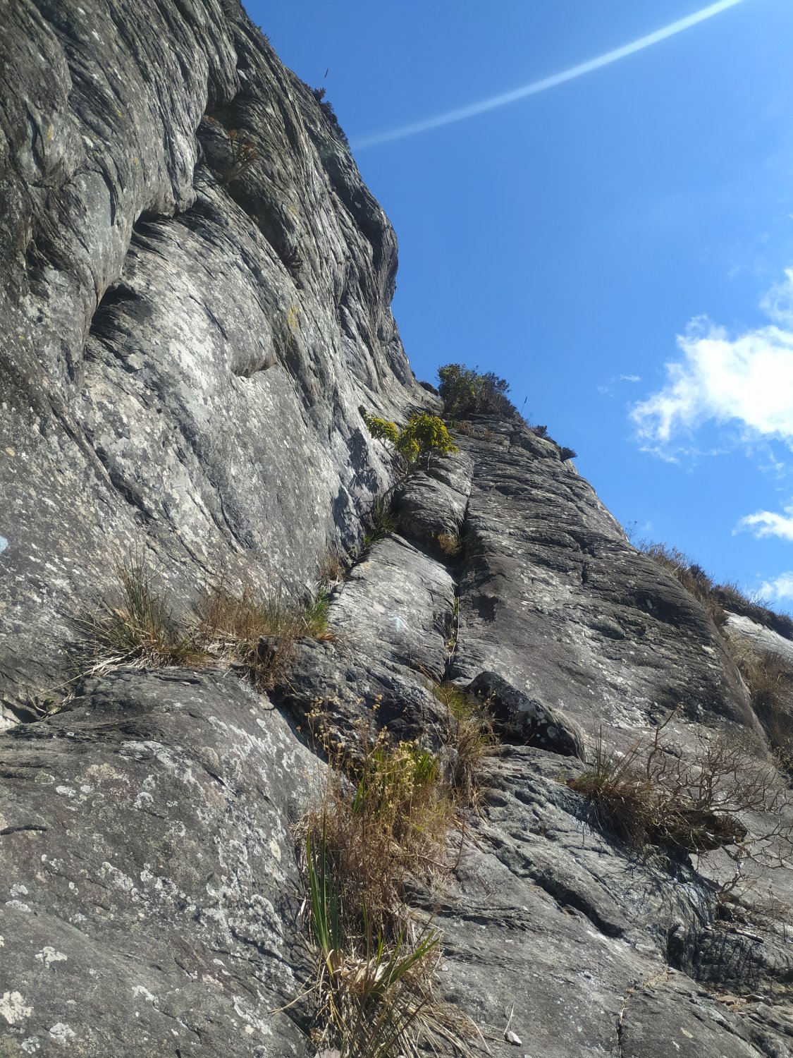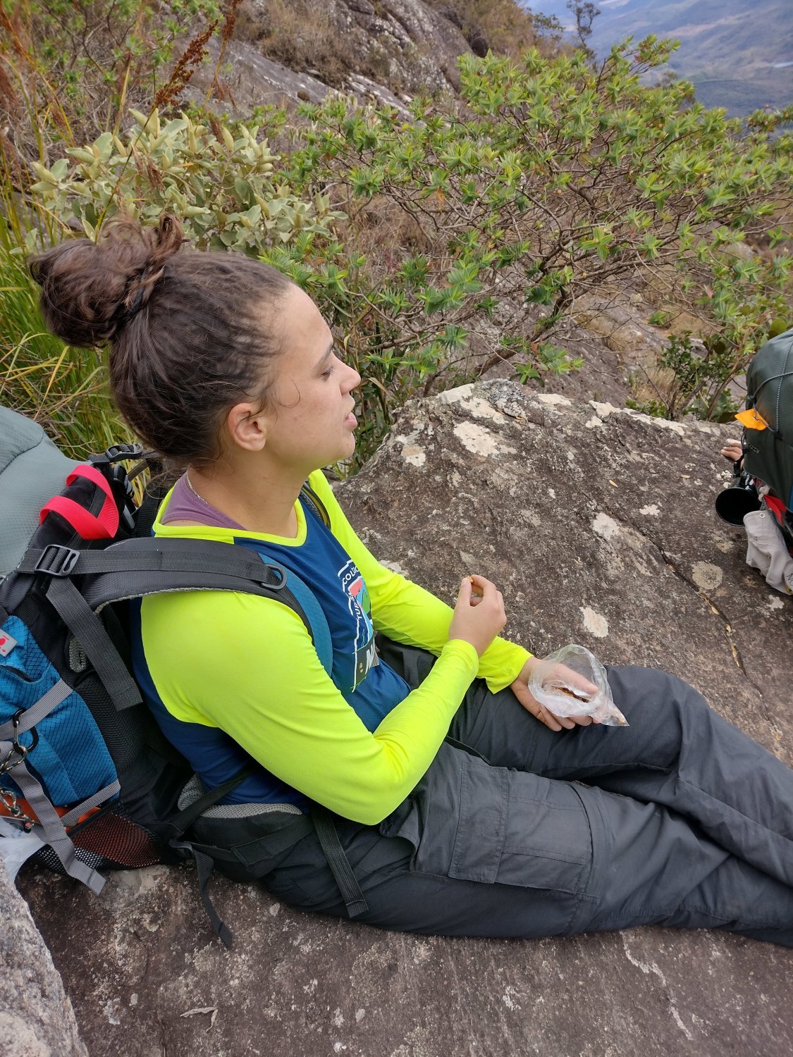 Já era esperado que íamos encontrar um trecho bem exposto de pedras e quando chegamos lá havia uma corda para ajudar a escalada, foi fácil, mas o que não sabíamos é que havia outro trecho pior que aquele anteriormente mapeado. Érica chegou no limite dela e declinou, parou por lá mesmo. Eu e Jef a deixamos com um pão para comer e seguimos com a promessa de não nos demorarmos.