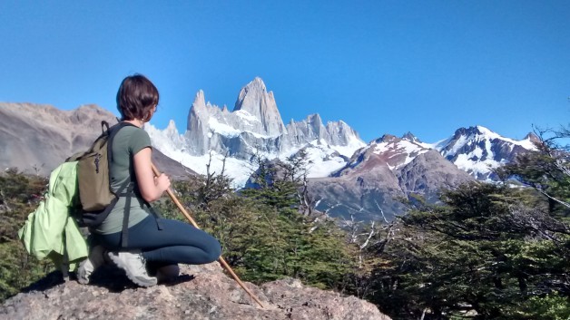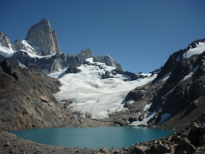 Já no final é que fica mais complicado: a subida é íngreme mesmo e a trilha tem muitas pedras, por vezes bem soltas. A trilha é muito frequentada, mas como até o acampamento não tem subidas fortes, a gente passa bastante tempo sem encontrar ninguém. Já nessa parte final, a galera tá a milhão - cada um no seu ritmo, de várias idades, com bastão, sem bastão, com mochila e até de all star, tem doido pra tudo, até uns que sobem correndo e eu não sei onde armazenam oxigênio! Quando estamos subindo, é irresistível não perguntar quanto falta e ai percebemos que muita gente não tem noção nenhuma de tempo ou distância... Mas na volta, quando somos nós a responder, a gente se dá conta que todo mundo mente mesmo pra não desmotivar ninguém. E vale cada segundo de esforço. O trecho é realmente difícil e olhando pra cima não se acredita que vai chegar, mas o prêmio é alto: a laguna de los três é maravilhosa e a paisagem não cabe na foto, é linda para todos os lados!