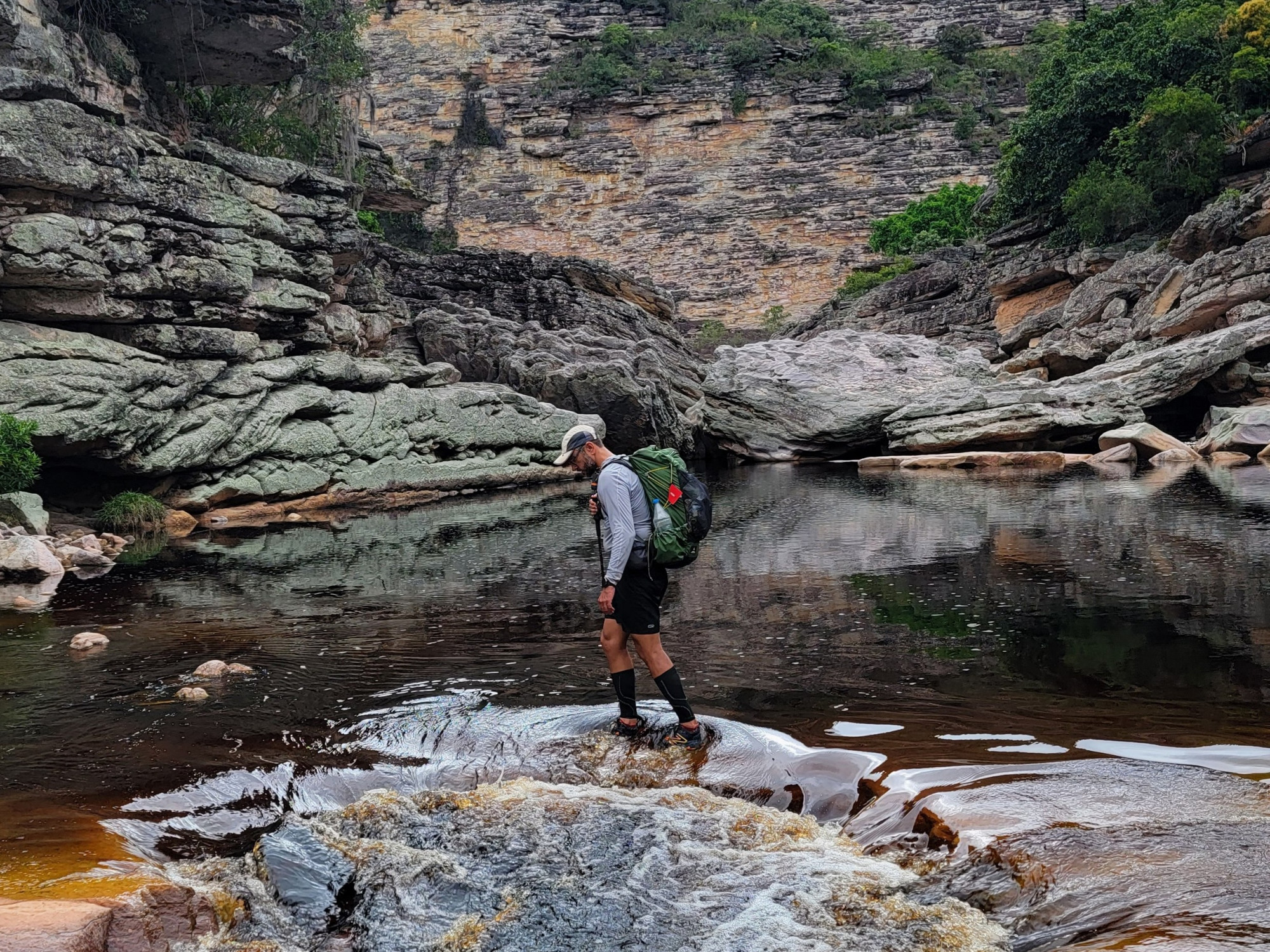 Em determinados momentos, o cânion chega em regiões que afunilam e que não se consegue subir ou descer as pedras devido à sua altura. Chegamos na primeira área desse tipo do dia e a trilha segue pela área de vegetação do lado direito do cânion. Em seguida, mais à frente, desce novamente para o leito do rio. Nesse momento surgem diversas tocas de pedra da época do garimpo.