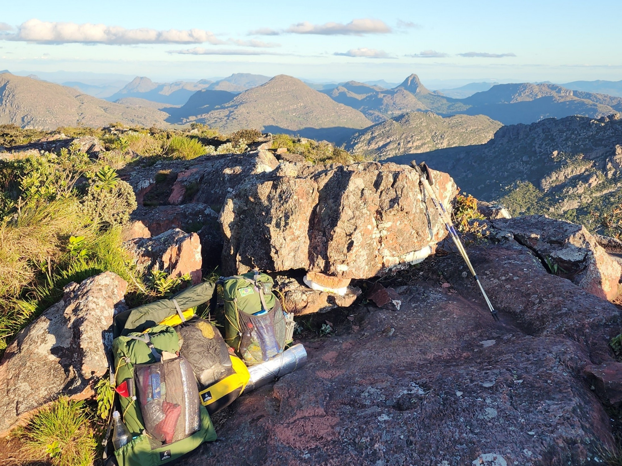 Pico do Cigano com vista para a Pedra Lisa (roupa com sinais de vários dias de travessia)
