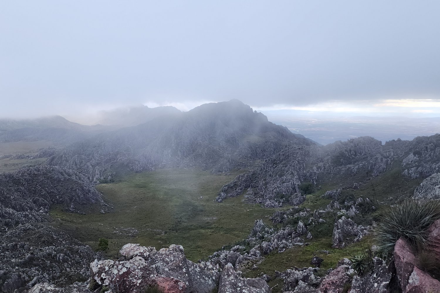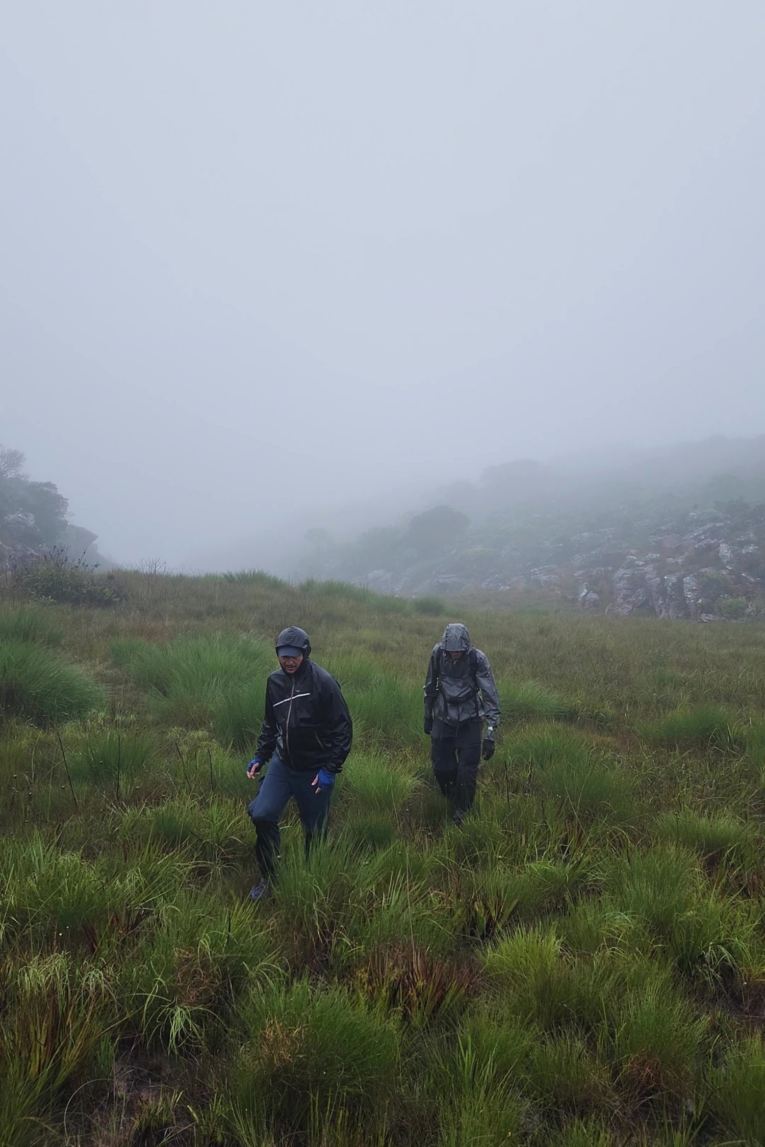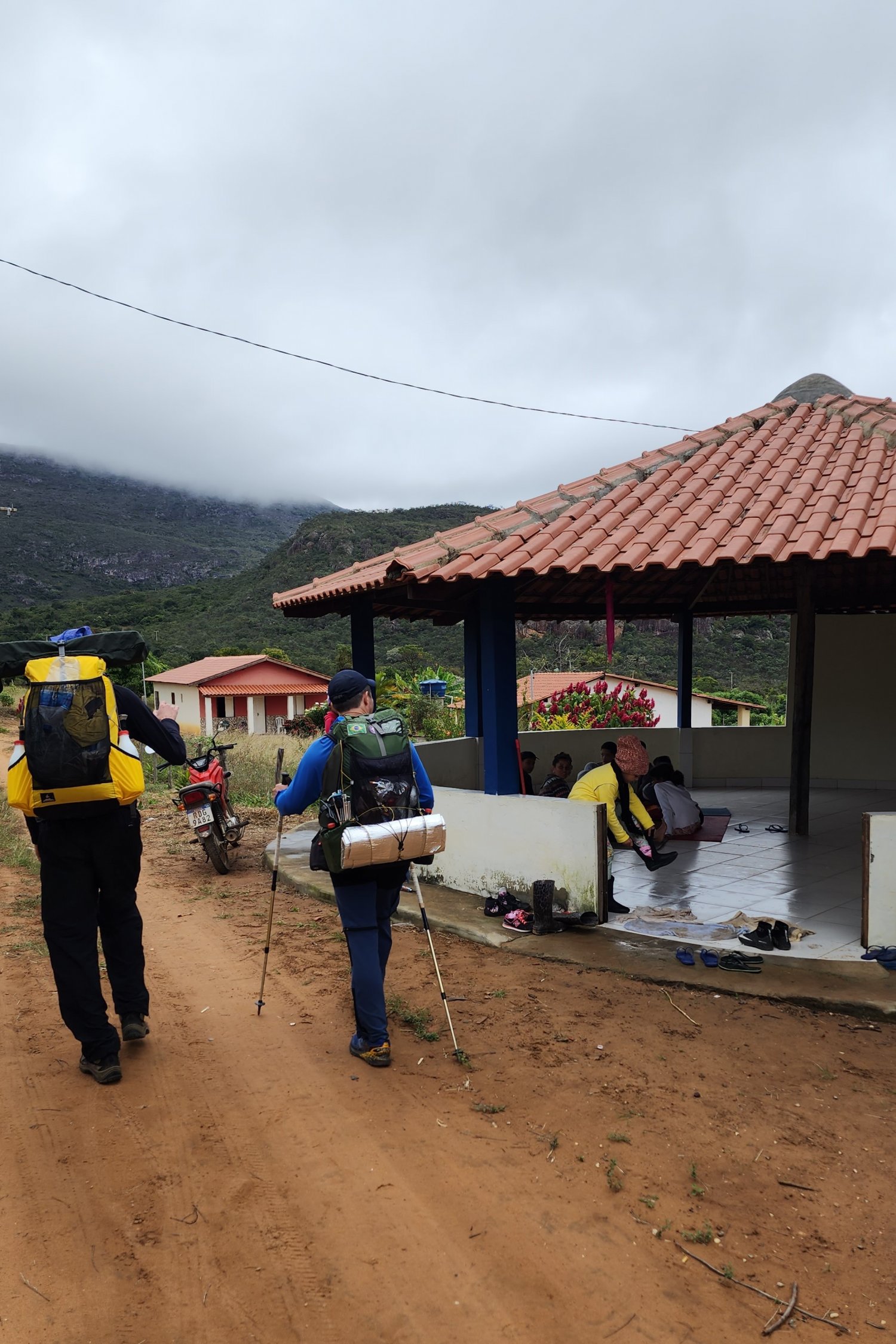 Nos hospedamos um dia antes na Pousada Portal da Chapada e no dia seguinte começamos a travessia. Esse foi um dia com terreno misto, andando primeiramente em estradão e depois em trilha até o pico. Na Chapada Diamantina, como de costume, logo cedo começamos a caminhar em meio a uma serração e uma chuva de leve que aos poucos foi se limpando no decorrer do dia. Saímos com pouca visibilidade.