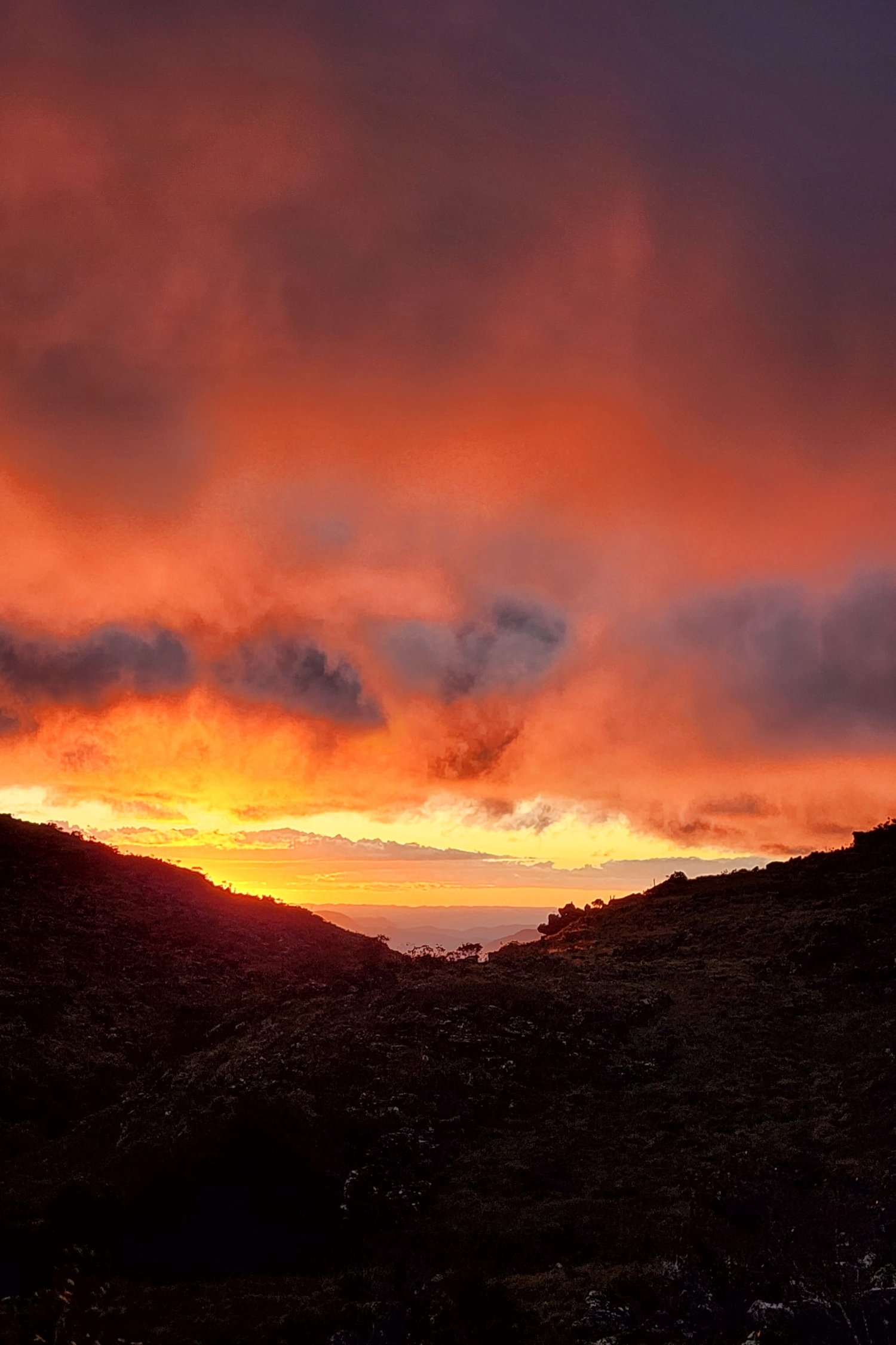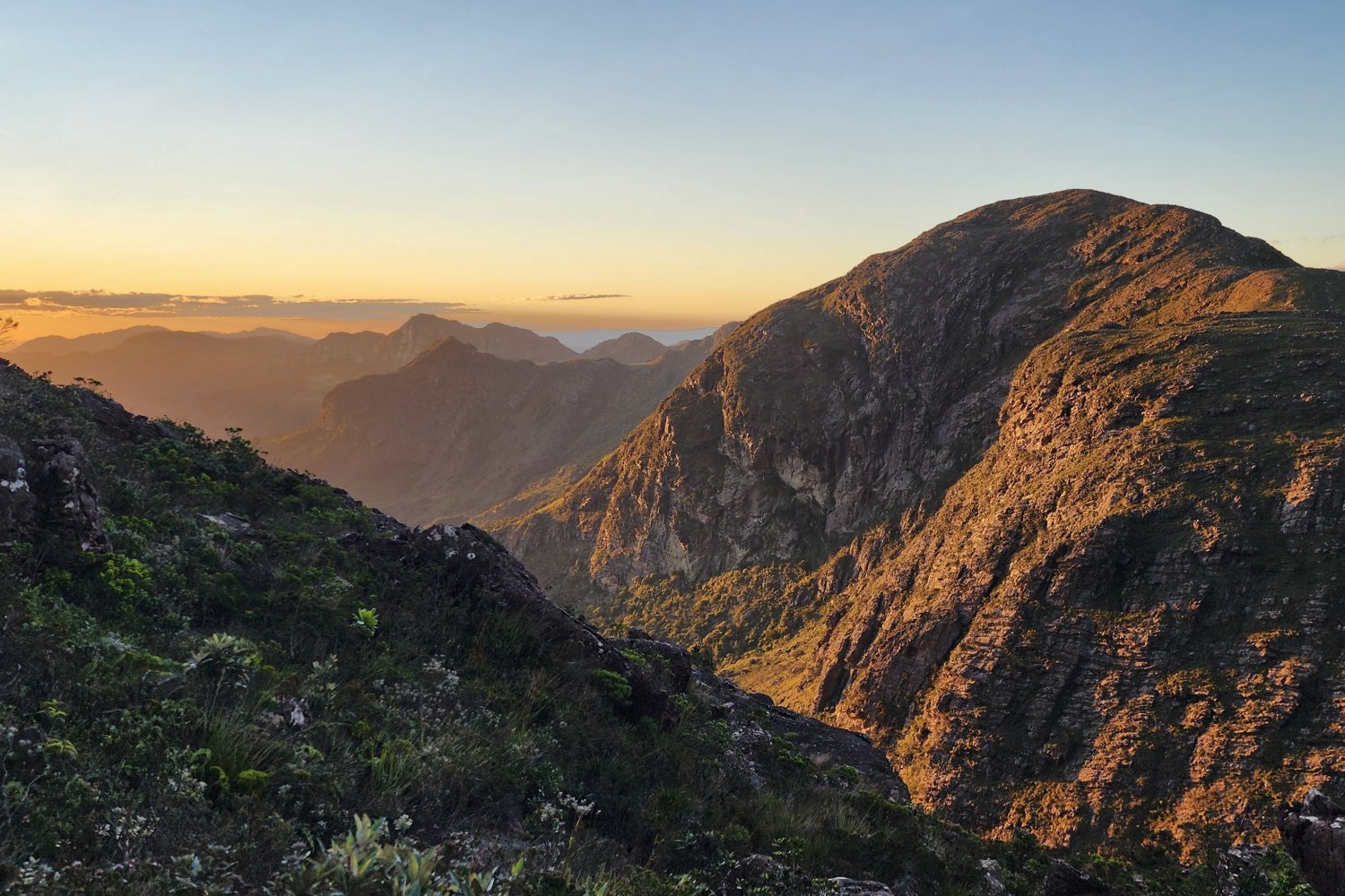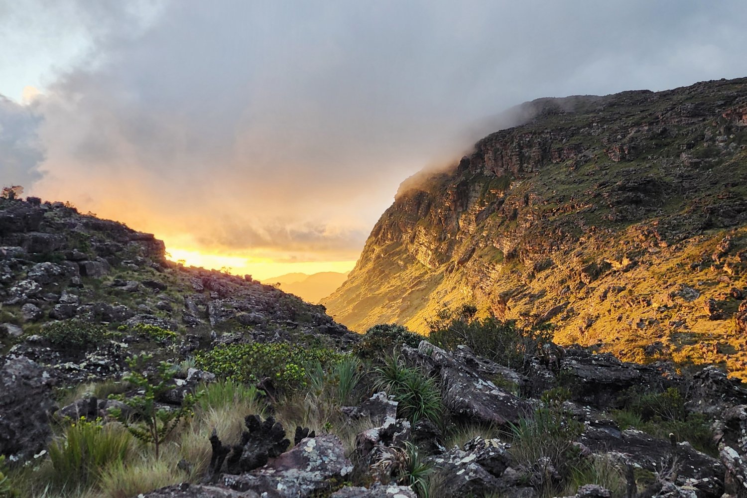 Pico do Barbado iluminado pelos raios do pôr do sol durante a descida do Pico do Castelo
