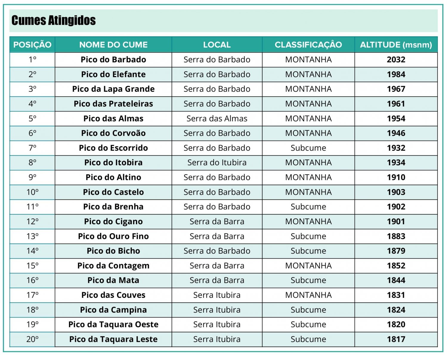 Segue abaixo a tabela com todos os cumes atingidos na travessia ranqueados por altura ao nível do mar. As altitudes da tabela foram obtidas durante a trilha usando o GPS de um aparelho de celular. Os nomes dos cumes foram os mesmos utilizados pelo Orlandinho no seu trabalho, bem como a classificação dos picos como montanha ou subcume (8).