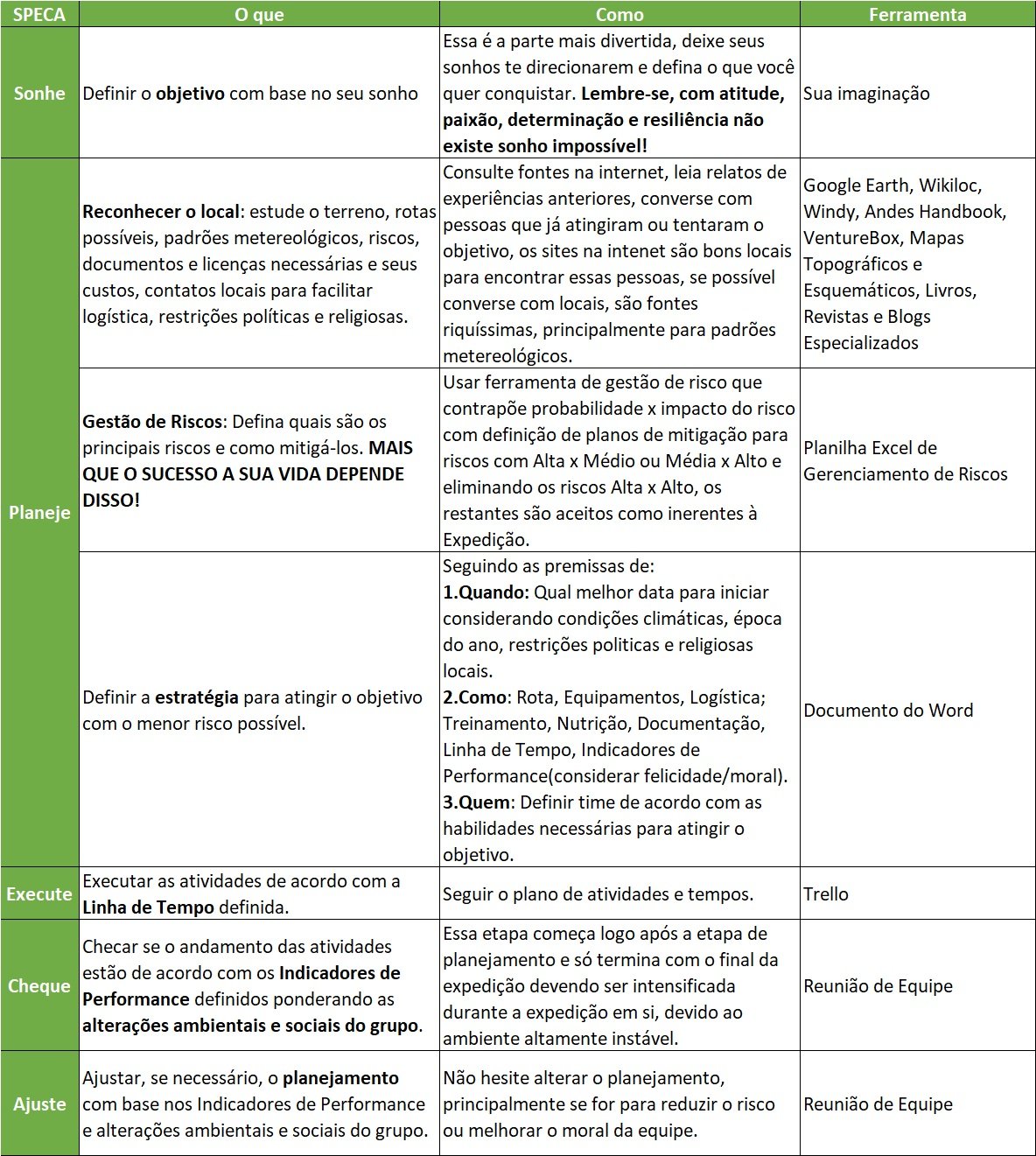 Eu, sendo engenheiro e metódico, naturalmente acabei aplicando e adequando a metodologia PDCA e conceitos de gestão de projetos para, respectivamente, processualizar e gerenciar o planejamento e execução das minhas aventuras, processo que apelidei como SPECA resumido no quadro abaixo.