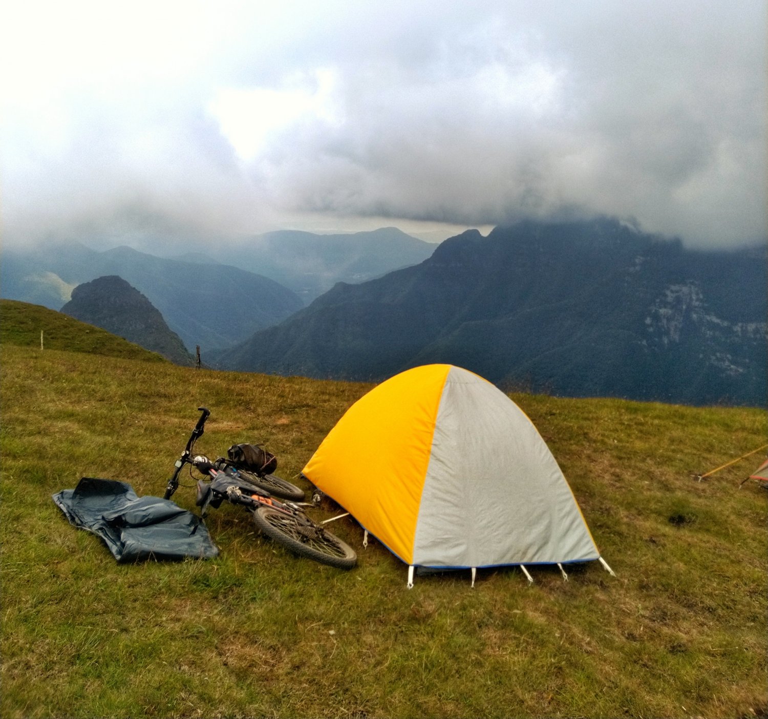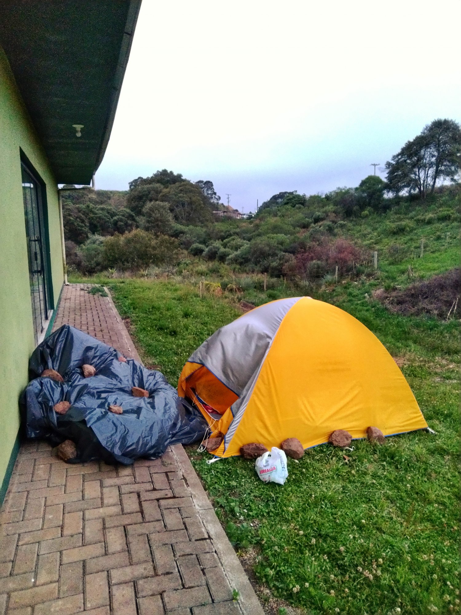 Como não recebi nenhuma ideia melhor, acampei por ali mesmo. Estava ventando bastante, por isso coloquei pedras ao redor da barraca e na lona que cobria minha companheira.