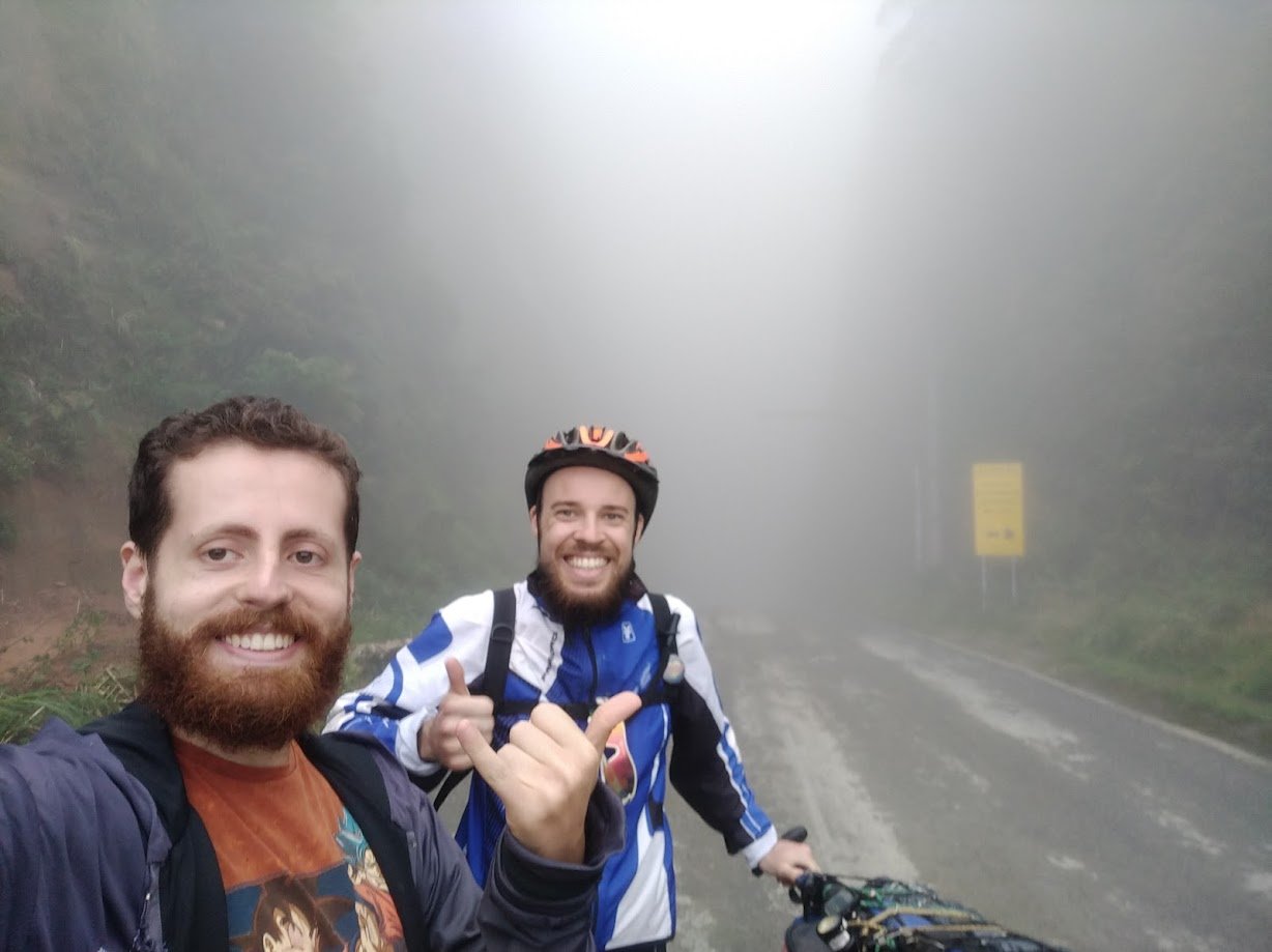 Enquanto esperava a neblina diminuir, comi um pastel ótimo que um casal vende por ali. Aguardamos mais um tempo, mas o tempo estava irredutível. Tiramos algumas fotos e combinamos de nos encontrar em uma bifurcação onde a estrada de chão que eu seguiria, se encontraria com o asfalto que o Matheus seguiria, em uma localidade chamada Bracinho. Mal sabia eu que isso seria uma péssima ideia. Depois descobri que meu amigo não havia entendido direito o que eu quis dizer e foi uma confusão.