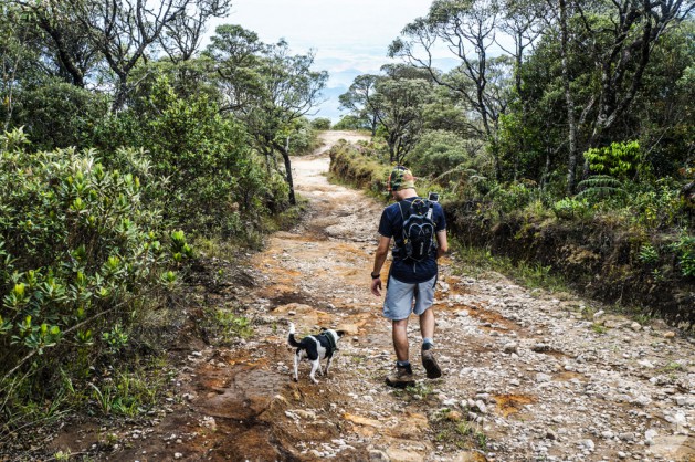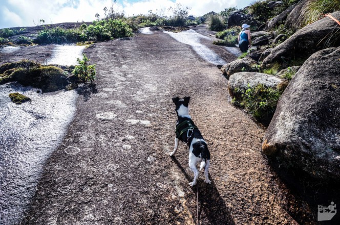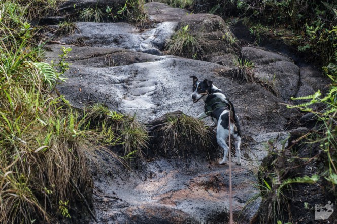 Durante a subida ele foi sem nenhum problema, já na descida ele ficou com medo, principalmente no trecho de escalaminhada, desci bem devagar ao lado dele para dar confiança e ele foi me acompanhando, depois desse trecho ele já ficou mais receoso nas demais rochas e em alguns pontos de pedras mais altas eu tive que dar uma forcinha para ele descer, pegando ele no colo.
