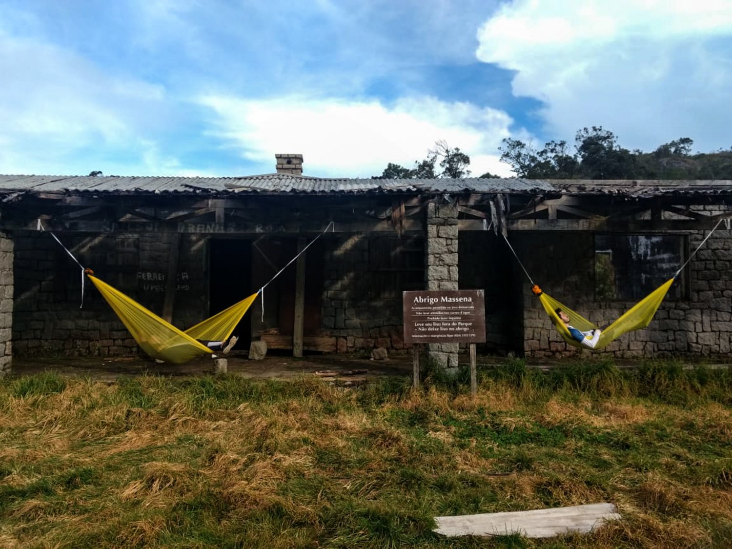Da base das prateleiras emendamos com a travessia Ruy Braga e seguimos sentido Abrigo Massena onde passamos a noite. O abrigo esta bem destruido, mas pelo menos na sua parte central ainda tem telhado, uma bela lareira e uma mesa. Chegamos nele mais ou menos as 15h, foram pouco mais de 11km, eu nunca cheguei tão cedo no destino do dia, não sabia muito o que ficar fazendo, montamos as barracas dentro do abrigo, depois armei a rede do lado de fora e ficamos lá sem fazer nada, só relaxando e esperando a noite chegar.