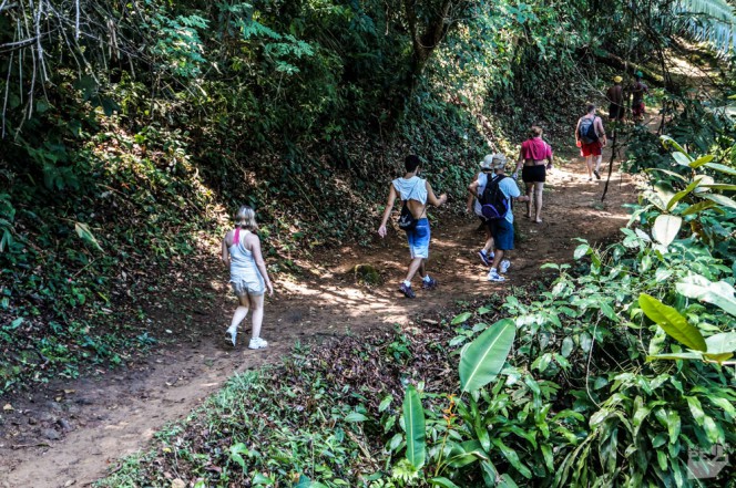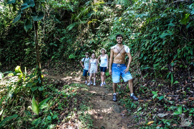 Iniciamos nossa caminhada na praia da Lagoinha logo cedo. Para achar o inicio da trilha não tem segredo, ela começa no lado esquerdo da praia, logo após o rio (nos falaram que atravessaríamos com água até na cintura, mas dessa vez não cobriu nem a canela), o começo da trilha é uma caminha tranquila com muitas arvores, ainda com casas do lado esquerdo e com a maior quantidade de turistas devido a ser o caminho para algumas praias que só se chega de barco ou pela trilha.