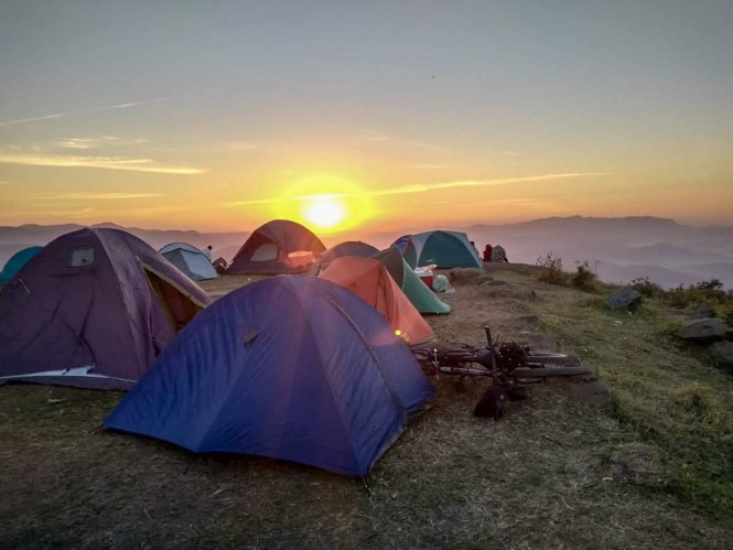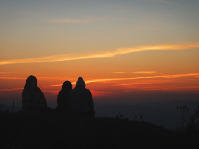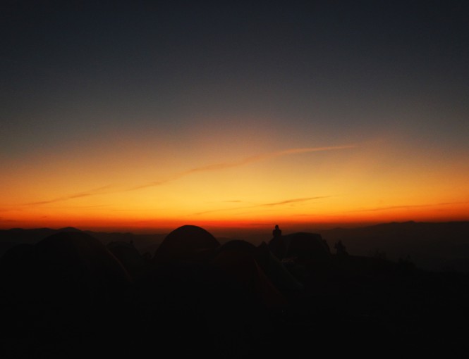 Pela manhã já se escutava de dentro da barraca as pessoas se concentrando do lado de fora. Esperavam no mirante do cume o sol nascer sobre o mar de nuvens que fez aquela madrugada, trazendo um espetáculo de cores no céu.