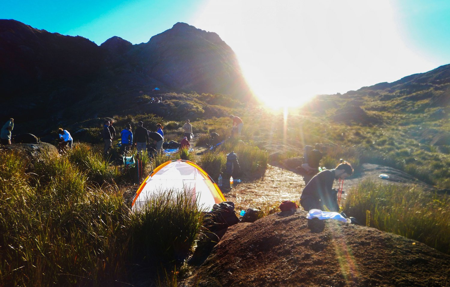 Paradas técnicas foram necessárias para recuperar o fôlego. E quando chegamos ao itaguaré não encontramos lugares próximos para montar nosso acampamento, estava bem cheio. Tivemos que dividir nosso grupo, cada um foi para um canto da montanha.