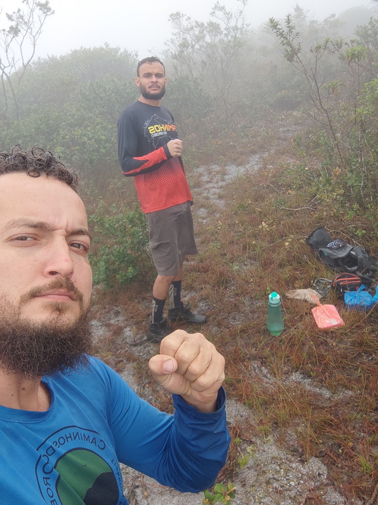 O dia já estava raiando, com uma chuva leve e muita neblina, logo no incio do caminho ao bater a foice em um galho eu dei a sorte de acertar bem uma maria fedor, ela pulou em meu rosto e já deixou o seu registro com um odor que dava até ancia de vomito, odor que é bem característico dela e foi próximo ao nariz o que potencializou seu efeito sobre min, lavei com bastante água mas mesmo assim não saia, então fui deixando de lado até que com o tempo e ao longo do caminho foi reduzindo, seguimos pela mata, passamos pela bica, e pela casa de Senhor, até ali o caminho é bem aberto não precisava de manutenção então deu pra adiantar um pouco. Saindo da casa de Senhor seguimos em direção a entrada da trilha que já estava bem fechada, Jones teve uma brilhante ideia de levar uma fita azul para ir marcando o caminho e assim iria facilitar para aqueles que desejam realizar a travessia. A gente se organizou da seguinte forma, eu fiquei com a foice e iria na frente abrindo caminho, enquanto Jones me seguia com o facão fazendo os detalhes e marcando o caminho com a fita. Seguimos dentro da mata e subindo até o limite dela, onde a mata deixa de existir e começa um jardim de canelas de ema, exatamente nesse ponto paramos para beber água e dar uma relaxada, eu como estava na frente ao virar o vaso de água ouvir um zumbido parecido de abelha e uma picada na mão esquerda, na mesma hora gritei para Jones, corre que tem abelha... Subimos correndo para se afastar um pouco e ver o que aconteceu realmente, assim que paramos Jones comentou que parecia ter sido marimbondo, um preto bem pequeno, a casa deles já estava agitada e com isso todos já estavam voando ali por perto, creio que bati na casa deles sem querer quando parei para beber água. Como era no caminho, decidimos tentar derrubar, já que iriamos passar ali na volta e também outra pessoa desavisada poderia passar e ter um acidente, Jones lançou a primeira pedra, passou perto, pegou uma segunda pedra bem maior que a primeira, se concentrou e lançou... Foi em cheio na galha da arvore onde ficava a casa, saímos correndo dali com receio de um ataque e seguimos nosso caminho mesmo sem ter a certeza de ter acertado ou não, deixamos para conferir isso na volta. Com muita neblina e uma chuva leve o tempo todo, ali já não havia mais a proteção da mata para quebrar os ventos, logo não demorou para sentirmos a baixa temperatura, por estar fazendo um exercitório não sentimos muito frio quando nos locomovemos, apenas nas paradas técnicas mesmo, que havia necessidade de fazer, já que estávamos carregando muito peso. Não demorou muito avistamos o cruzeiro e logo em seguida demos uma pausa ali mesmo, descansamos coisas de 20 minutos, tempo suficiente para um café e decidir por onde iriamos dali pra frente. Café tomado, barriga cheia, hora de voltar para o trabalho afinal já era 07:40 e o tempo continuava fechado com pancadas de chuva o tempo todo.