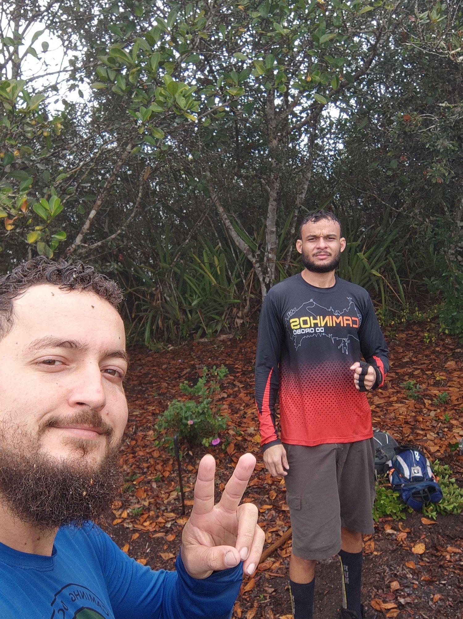 Conseguimos chegar no primeiro acampamento base as 10:14, decidimos relaxar um pouco e comer alguma coisa, o local que escolhemos para descansar já é usado como base para acampamentos, pois conta com um proteção de uma vegetação, que quebra os ventos e protege até mesmo de chuvas, deixamos nossa mochilas la novamente e seguimos apos um breve descanso, pois sabíamos que nossa próxima parada seria para almocar e ainda tinha um grande percusso pela frente. A partir dali vimos que o caminho estava bem fechado e sabiamos que naquela parte sempre a gente tinha duvida por onde passar, já que era muito fechado e tinha muitas bifurcações devido aos animais que se perdem, isso incluindo a gente mesmo, pois não foram poucas vezes que nos perdemos rsrssrs. Decidimos fazer uma boa limpeza naquela area, assim para não ter duvidas de quando passar por ali novamente, Jones nesse trecho reduziu as distancias entre as fitas para facilitar a identificação principalmente a noite, que sempre tem neblina devido a altitude. Seguimos o caminho que já passamos algumas vezes e fomos abrindo mais um pouco, pois até então aquela parte não tínhamos dado nenhuma manutenção, as horas vão passando e a chuva volta e meia bota a gente pra correr e se abrigar debaixo de algum arbusto, até amenizar e voltar pro serviço. O tempo no meio do mato não passa, ele voa amigos, pois quando olhamos no celular já era mais de meio dia, montamos acampamento e decidimos almoçar ali mesmo em uma clareira, longe do nosso destino final ou que pensávamos que iria chegar, acabamos decidindo outro ponto de parada do serviço, pois já era meio dia e nem estávamos na metade do percusso planejado e assim esse virou o tema do nosso almoço, decidimos ir até o mirante de Val da Jaca.