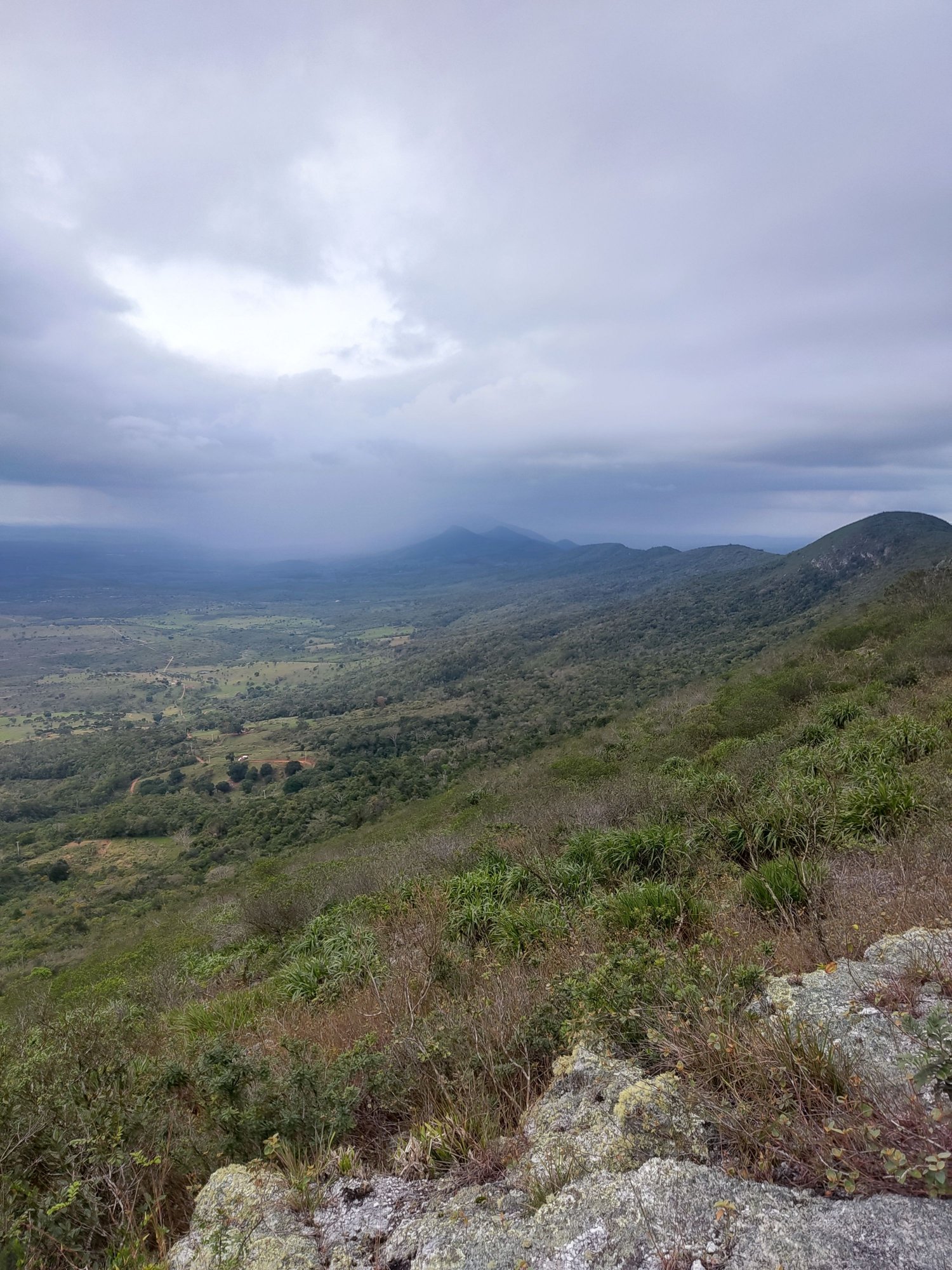 Exatamente as 16:20 chegamos no mirante, exaustos, sujos e acabados, decidimos relaxar um pouco e descansar 10 minutos a 15 minutos, já que de longe era possível observar uma chuva passando pela cidade e vindo em nossa direção, eu logo disse a Jones que iriamos tomar aquela chuva na volta de casa, mas Jones muito otimista deu risada e falou que ela iria espalhar, não é que ele acertou, a chuva fez uma volta e seguiu seu rumo longe da gente dessa vez. Após apreciar a paisagem e tirar algumas fotos é hora de voltar, arrumamos nossas mochilas, e saímos de lá por volta das 16:40, voltamos em um bom ritmo e observando o nosso serviço, que diga de passagem ficou muito bom. Por incrível que pareça chegamos no cruzeiro em uns 40 minutos, foi muito rápido, o que levamos quase o dia todo para limpar, na volta gastamos 40 minutos, pegamos a garrafa de cafe e a água que deixamos no cruzeiro e começamos a descida mais ingrime, ao chegar no limite do jardim de canela de ema, la estávamos mais uma vez, perto do marimbondos, observamos de longe e não vimos a casa, ficamos com medo de estar no chão e a gente acabar pisando, a ideia era só uma, passar abaixado correndo e foi isso que a gente fez, passamos tão rápido que deu apenas para observar que a casa foi derrubada e a galha estava cheio deles, porém não vimos a casa em lugar nenhum. Logo começou a escurecer e ao entrar na mata já foi preciso ligar uma lanterna, pois não é uma boa ideia andar por ai no mato, escuro e sem lanterna, passamos pela casa de Senhor ja com os últimos raios de luz e ao entrar na mata uma escuridão total, um silencio que encanta. Chegamos no Rancho as 18:05, descemos até a área de camping para devolver os vasos de água que pegamos na subida. Agora a missão era tirar o carro de onde deixamos, já que na madrugada acabamos deixando o carro meio que em uma valeta, para dar passagem a outros transportes, por nossa sorte as chuvas aqui no pé da serra não foi tão intensa quanto la em cima, com isso o solo já estava mais seco e não foi difícil sair com o carro. Ao entrar no carro e sentar no banco pude ter a noção de quanto estava cansado, mas mesmo assim muito feliz por ter realizado o serviço mesmo não tendo concluído mais uma vez, porém o que realizamos ficou muito bom e valeu todo o esforço. Ao longo da volta pra casa conversando com Jones já pensamos em uma nova data para voltar e realizar o serviço, pois a vontade é grande de terminar e ver uma trilha limpa em que todos possam transitar sem problemas. A volta pra casa foi ao som do O Rappa, com uma leve chuva e um vento gelado, o cansaço era tanto que era nítido em nossos rostos. Chegando na cidade fui pegar a moto na casa de Jones, com uma recepção calorosa de seu pai, Seu Didi, um senhor muito gente boa que tenho muita admiração por sua historia e pessoa que é, um exemplo de cidadão. Logo já fui me aconchegando e sentando um pouco para descansar na garagem, que as noites vira uma pastelaria, o melhor pastel da cidade, na minha humilde opinião ! Enquanto Jones entrou pra casa e foi tomar um banho eu fiquei ali conversando com meu amigo Didi, enquanto ele preparava um delicioso pastel, que ai de min se eu for la e não comer um, já é tradição !!! Jones logo se juntou a nos na mesa e continuamos a conversar por um breve momento, Me despedi deles, agradeci pelo pastel e a Jones pela parceria em toda essa aventura que ainda ha de continuar na próxima semana. Até breve !!!