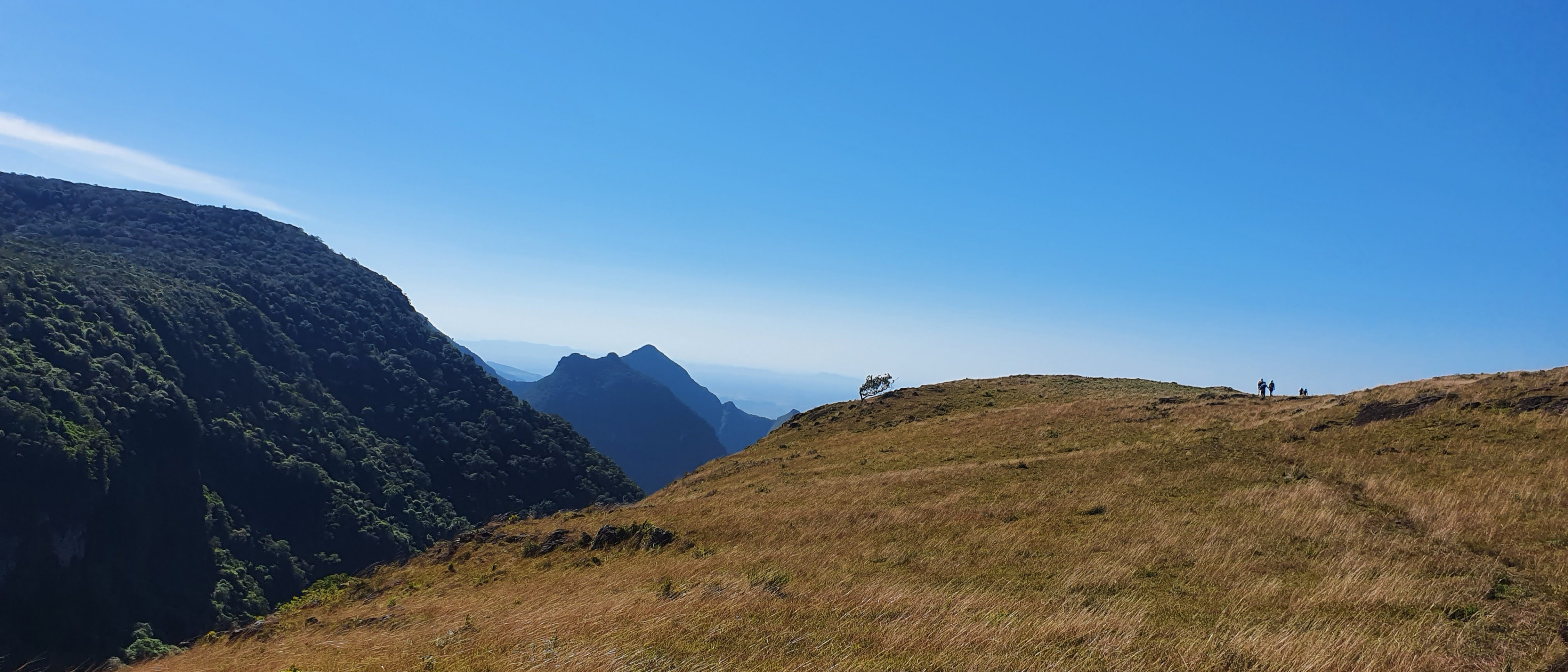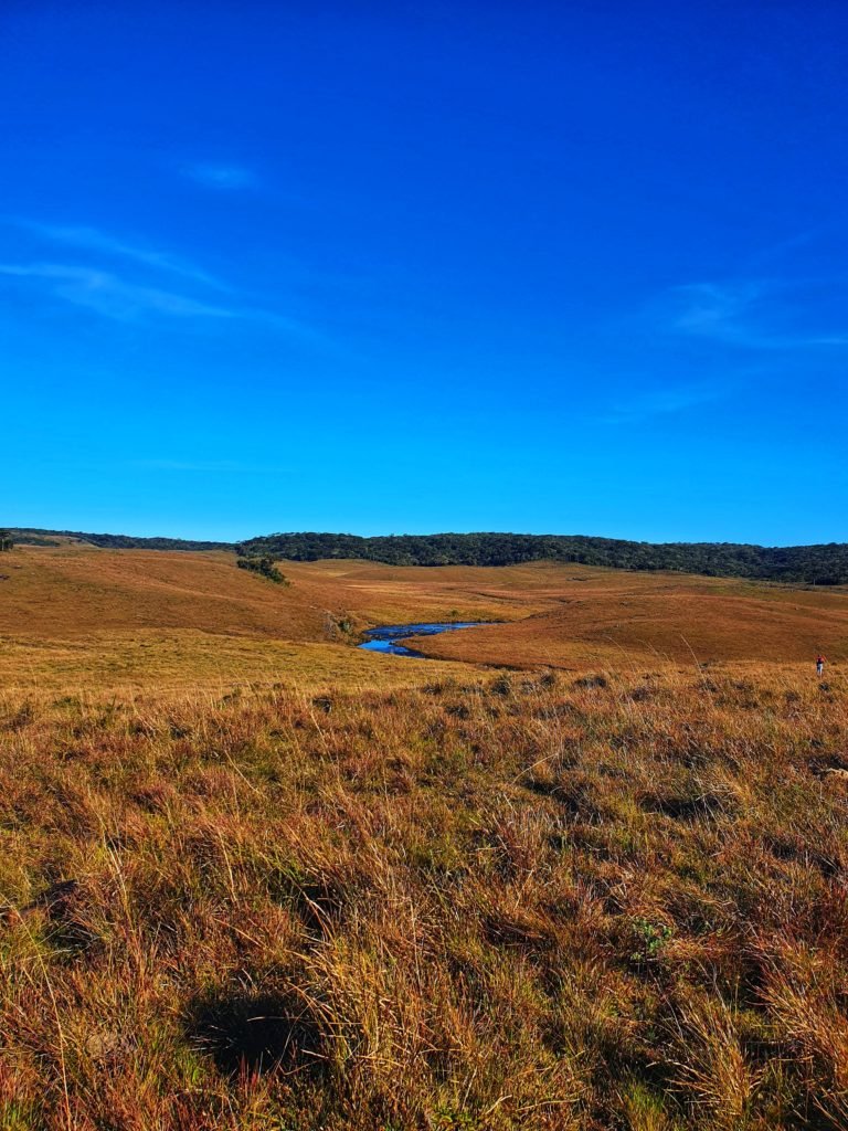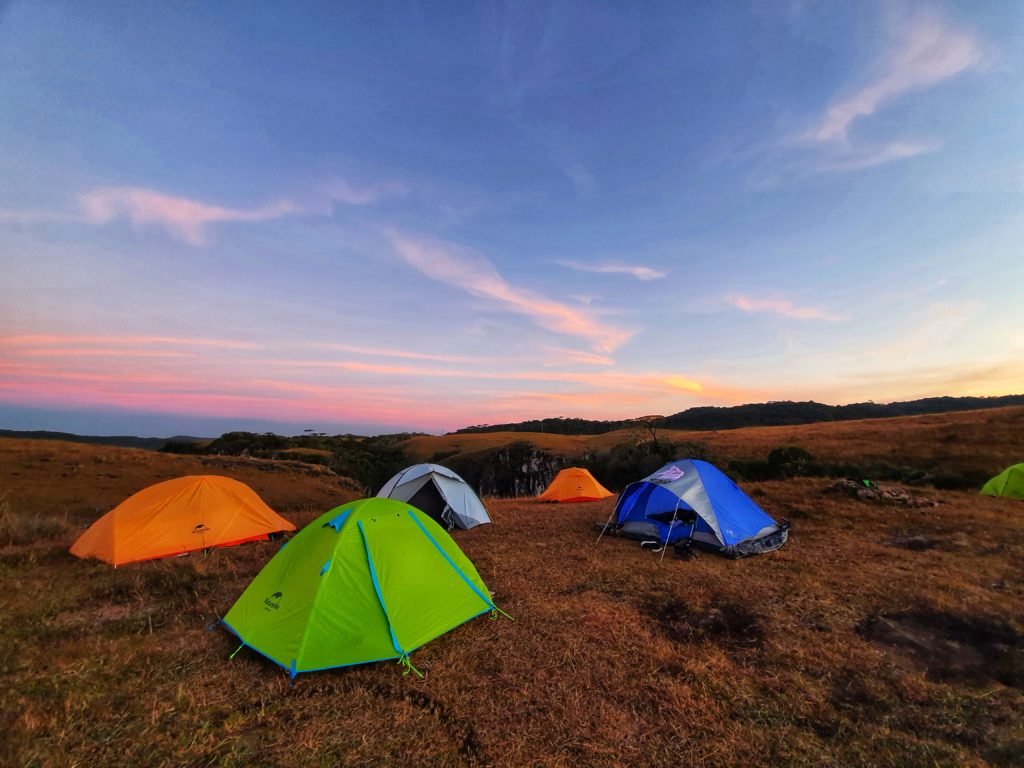 Depois de tanto esforço, chegamos ao topo, onde caminhamos pelos campos abertos e estradas de chão até chegarmos no nosso ponto de acampamento (selvagem, é claro). Foram cerca de 12km de caminhada no primeiro dia.