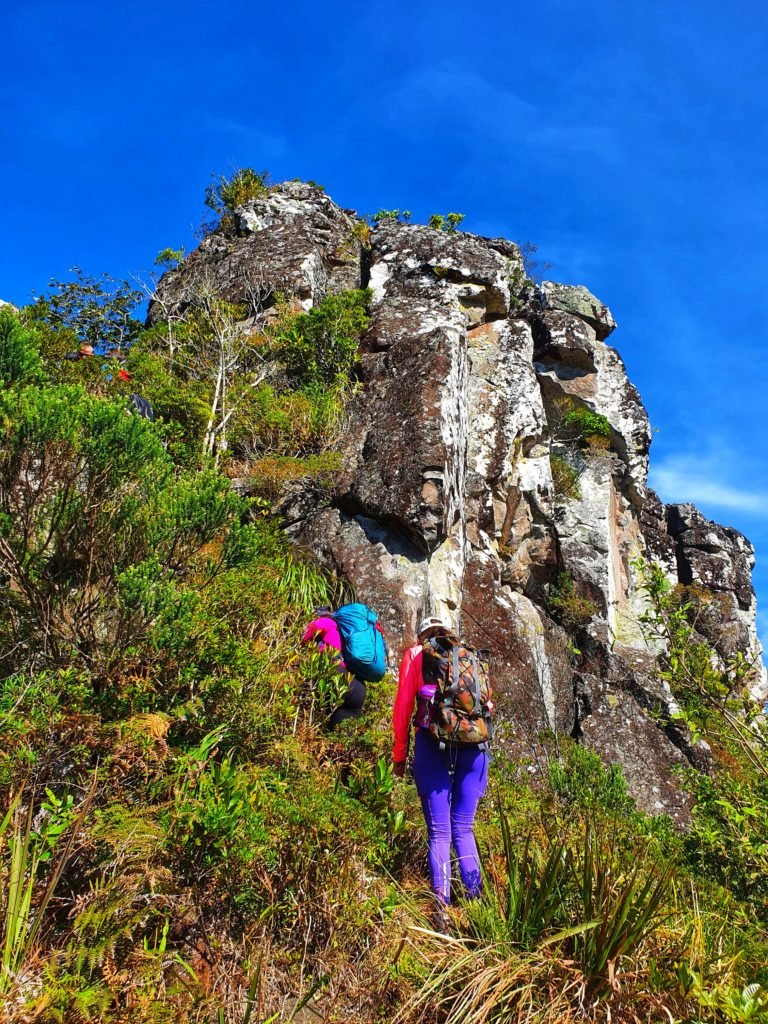 A dificuldade da subida se intensificou um pouco quando chegamos à parte mais rochosa, que demandam um pouco da popular “escalaminhada”, mas em compensação, aumentaram também os números de mirantes e belos lugares para uma pausa para descansar e fazer um lanchinho.