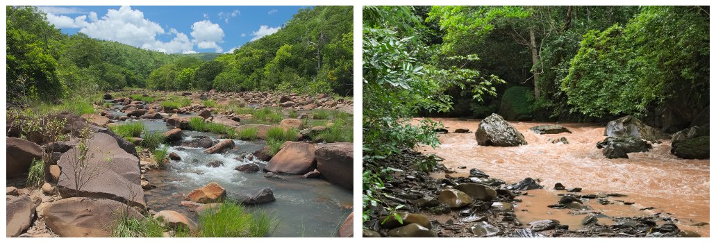 O leito dos córregos é em geral forrado por rochas de todo tamanho e vão ficando naturalmente maiores e mais difíceis conforme a aproximação da queda. São também estreitos e confinados, embora o Córrego Buritis (foto a esquerda) seja uma surpreendente exceção.