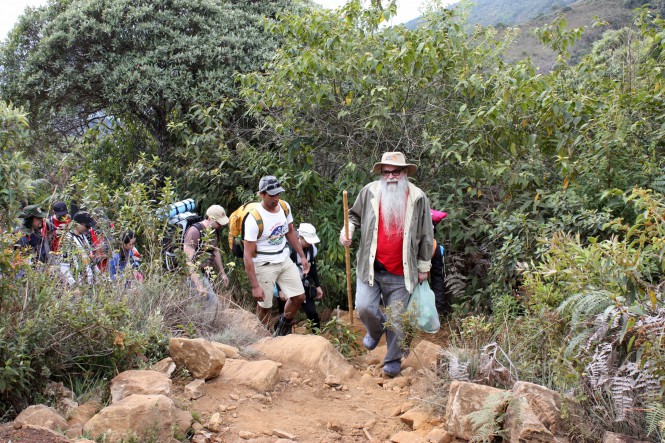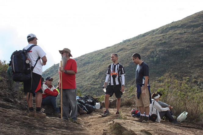 Detalhe para este senhor que estava no grupo. Que equipamento que nada! Subiu a trilha de Crocs e uma sacola de supermercado. E a gente preocupado com bota, etc...
