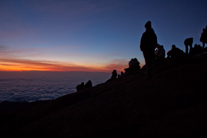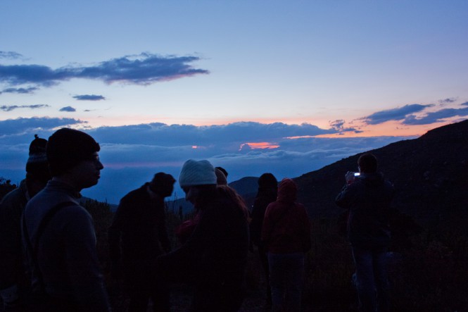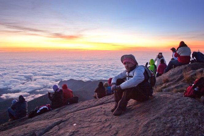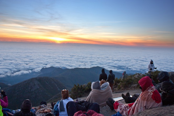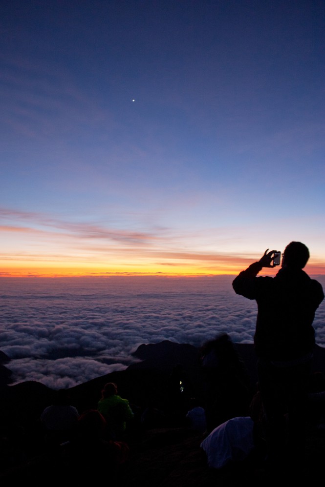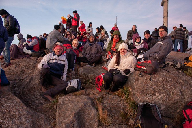 Chegamos ao pico em torno de 5:40h. Muita gente já ocupando os espaços para aguardar o nascer do sol. Colocamos de volta as camadas de roupa. O céu estava muito bonito, bem limpo. O tempo ajudou bastante.