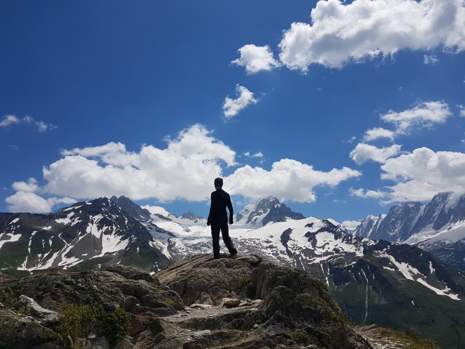 Deixando o Refúgio de Balme, há algumas opções de caminho a se tomar: Uma descida direto à Le Tour ou Argentiere, descer via teleférico até estas cidades ou seguir a variante pelo pico Aiguilette des Posettes. Como eu estava me sentindo bem, decidi por esta última. Opção acertada, pois logo após a última subida do dia, alcancei um dos pontos mais bonitos do tour. Do pico, é possível avistar todo o vale, o Mont Blanc e glaciares em volta. Fiquei por ali por um bom tempo curtindo aquela visão. E depois segue-se uma longa descida até Le Tour.