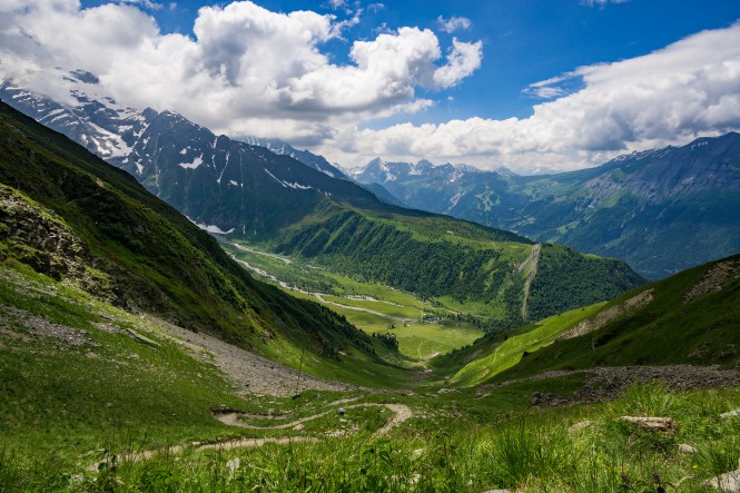 Não se passou muito tempo de caminhada e o tempo se abriu. Foi uma descida monótona através de caminhos rochosos. Em Les Chapieux, parei em um refúgio para um café. O caminho adiante seguia pelo asfalto, iniciando uma extensa subida pelo vale.