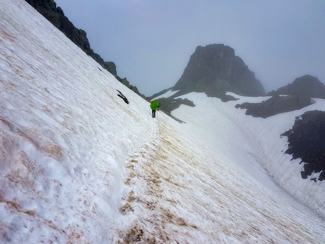 O dia amanheceu nublado. Um nevoeiro espesso pairava sobre o abrigo e tapava a vista das montanhas ao redor. Eu deveria decidir se seguiria a descida até Les Chapieux ou iria pela variante pelo passo des Fours. Esta variante encurtaria a distância até o refúgio Des Mottets, porém prometia ser tecnicamente difícil e, conforme falado pelo Saudita em Les Contamines, havia muita neve e estava fácil se perder ou mesmo cair por lá. Um francês que eu vinha encontrando pelo caminho me convenceu a seguir por Les Chapieux, por conta do tempo feio. Posteriormente, um casal de suecos que havia passado pela variante me disse que eu havia feito a escolha correta. Que cruzaram por lá com tranquilidade por conta da experiência prévia com a neve, algo que seria difícil para alguém sem tal habilidade.