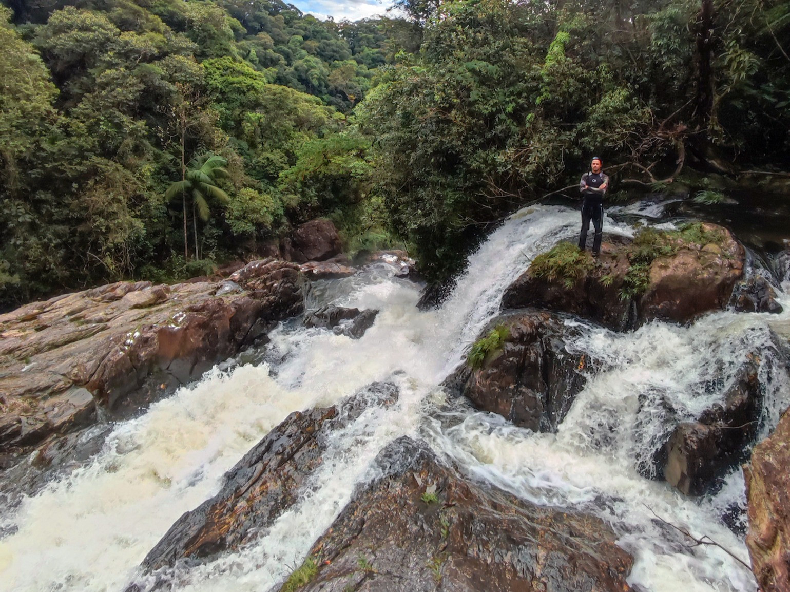 Continuamos a caminhada pela direita do rio, seguindo o rasto do trio apressadinho que ia tacando marcha na nossa frente. Vinte minutos depois, logo à nossa esquerda se formava uma outra garganta, fazendo de sua cabeceira um mirante chamativo. Pelo estrondo que fazia, era possível ver que a próxima cachoeira era enorme e imponente. Foi instintivo, sabendo que em 10 minutos de vara mato a gente estaria na base dela, Kalidon, que ia na frente, começou a descer na direção do poção. Era uma piramba muito inclinada (40°), de vegetação rasa sobre a rocha, sem fixação nenhuma, tudo era babado pelo spray/chuvisco que vinha da cachoeira. Isso deixava qualquer centímetro de solo escorregadio ao extremo. Pela única via segura que parecia ter, Kalidon e Vitória foram na frente. A passagem dos dois, deixou rastro inseguro, pois a vegetação rala que tinha eles arrancaram toda. Fiquei cabreiro, mas tive que descer. Mas não daquela maneira. Avistei o último ponto de apoio seguro, o próximo era uma árvore da grossura da minha perna. Calculei escorregar até ela, isso dava uns 7 mts de descida, apoiar a sola do pé esquerdo para amortecendo o impacto, e seguir com mais segurança a partir dela. Porém, não fui um bom matemático. Ari foi buscar outra rota.