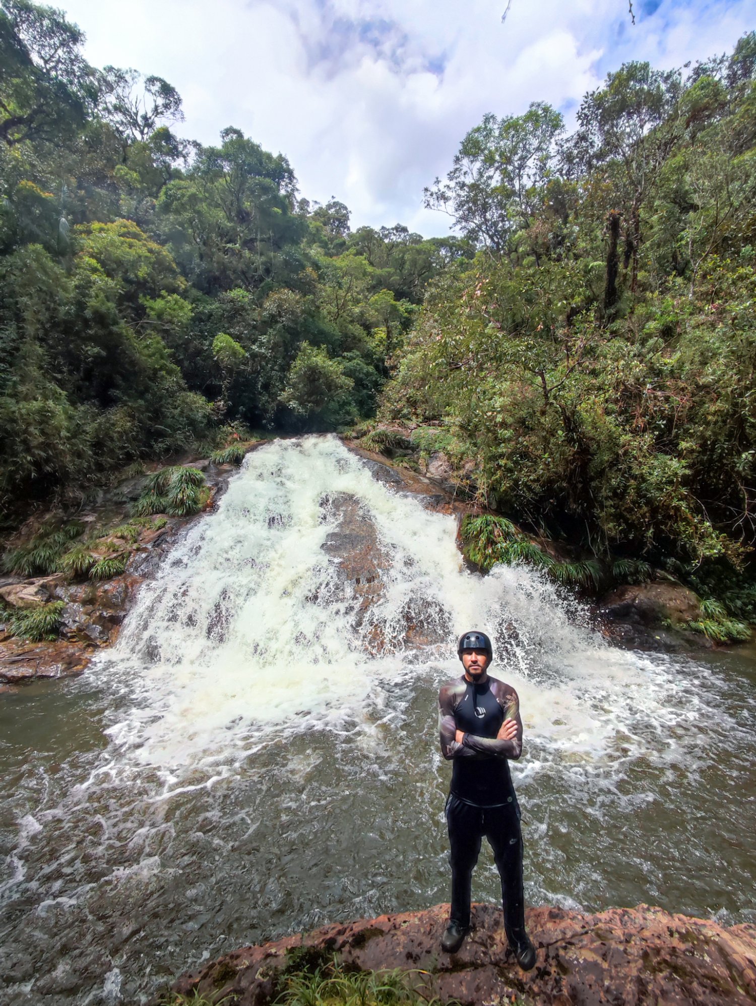 cientes de que após aquela curva começaria a parte difícil da expedição e que, gradativamente, o grau de dificuldade só aumentaria. Pós pausa para a primeira sessão de fotos e análise de terreno seguimos. A canaleta do rio se estendia numa reta considerável até formar um U, onde, acima de uma cachoeira, o Tony achou um resto de calça e uma moeda de 10 cents de Euro. Quando chegamos ao final desse U, sabendo que ali era o ombro da Serra e o topo da primeira grande cachoeira que daria sequência a uma garganta absurda, detentora de enormes quedas, instalamos a cápsula do tempo do lado direito da cabeceira. Assim, quem passar poderá registrar sua passagem. Perdemos um tempão por lá. Isso fez o David bufar de raiva. Ele já havia descido um pequeno trecho, curto mesmo, de vara mato e ficou nos esperando. Ficamos uns 25 minutos, ou mais, por lá, e quando ele decidiu voltar, chegando até nós, já estávamos de partida. Ele ficou mais nervoso ainda. Se largou o chão e disse que não desceria por ali de novo. Não quis nem tirar foto com o grupo. Kkkk