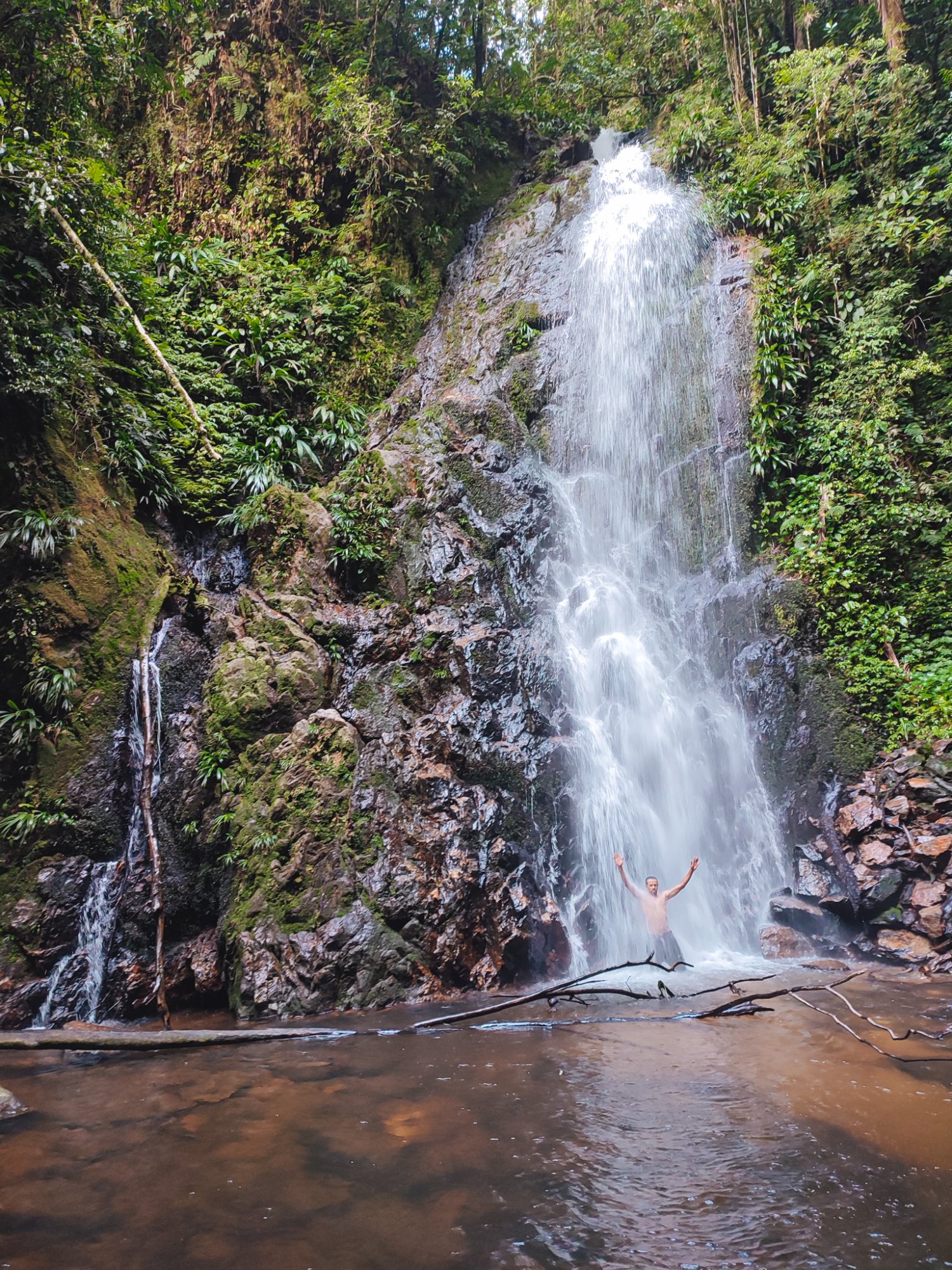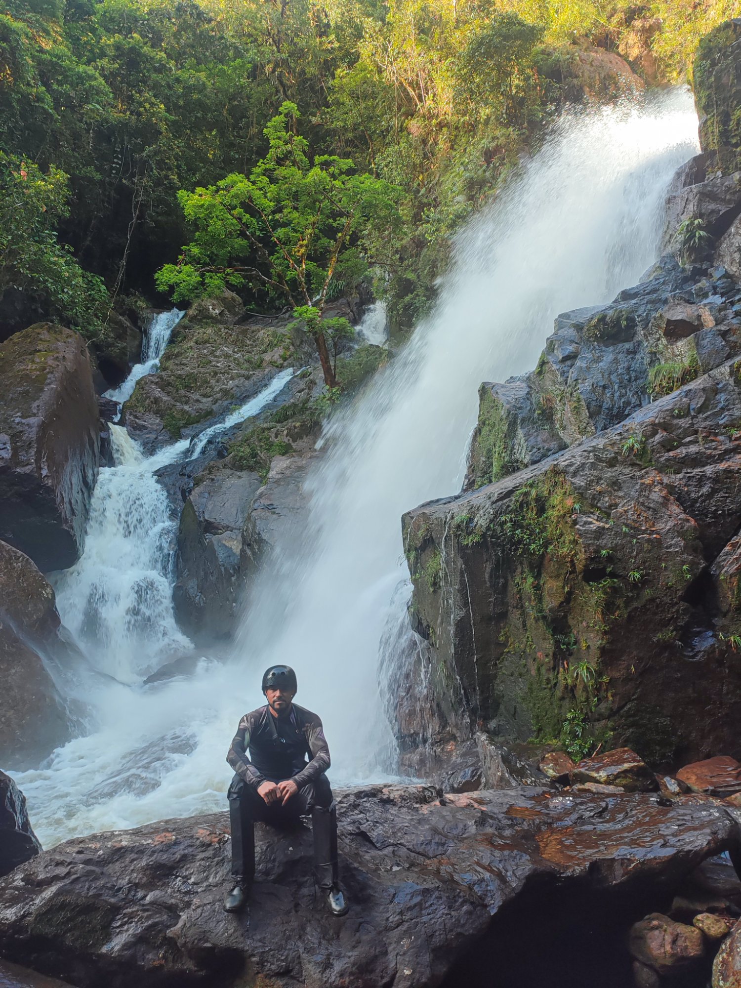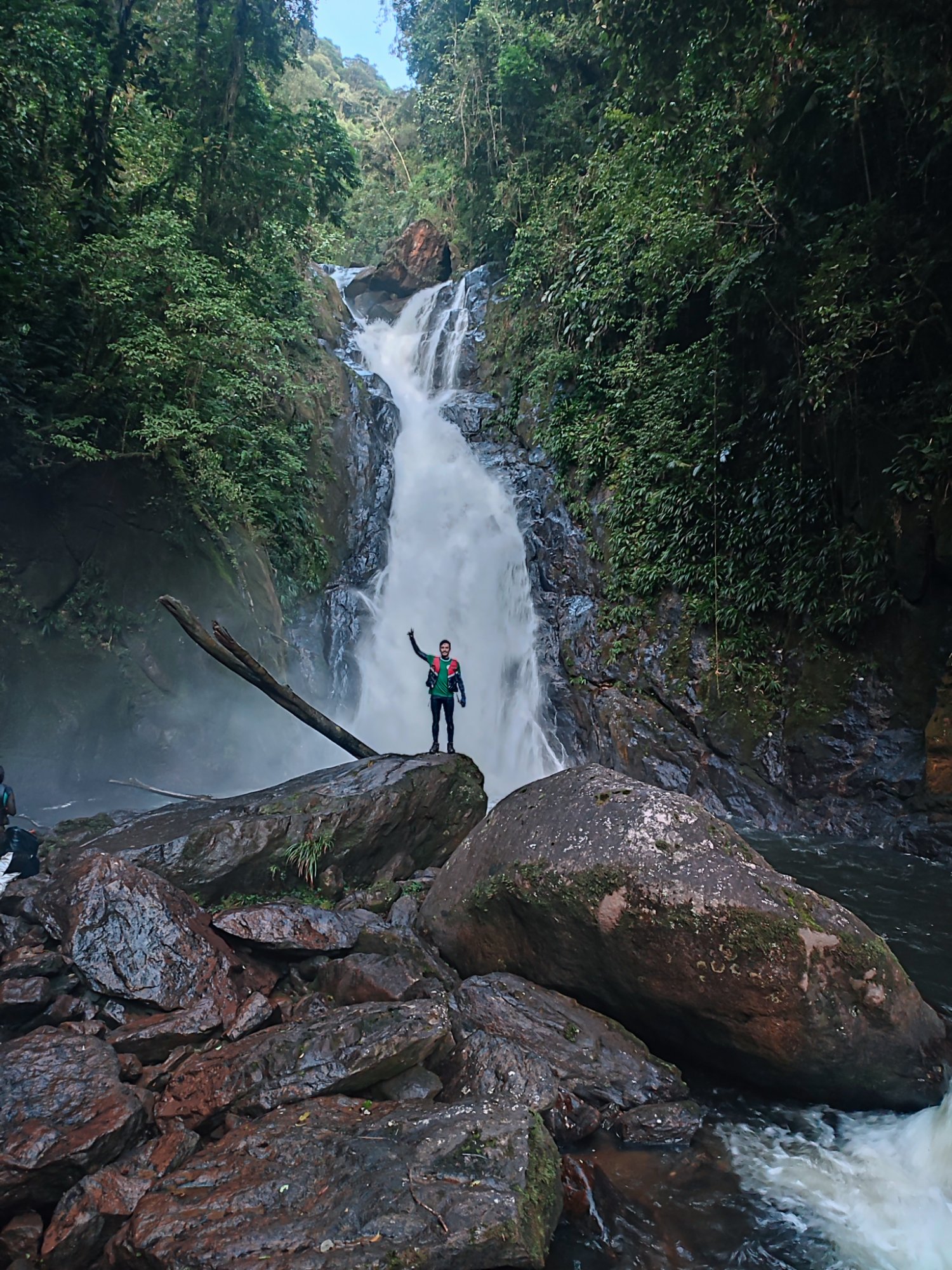 Ari, Kalidon e eu chegamos nela num piscar de olhos. Vitória, que não iria, chegou logo depois. A cachoeira estava em um cenário perfeito, confinada entre a mata que fazia uma espécie de cúpula protetora não permitindo a entrada direta da luz do sol. Gastamos apenas o tempo suficiente para cada um tomar uma leve ducha sob a queda água de uns 25 mts, tirar umas 3 fotos cada um e partir.