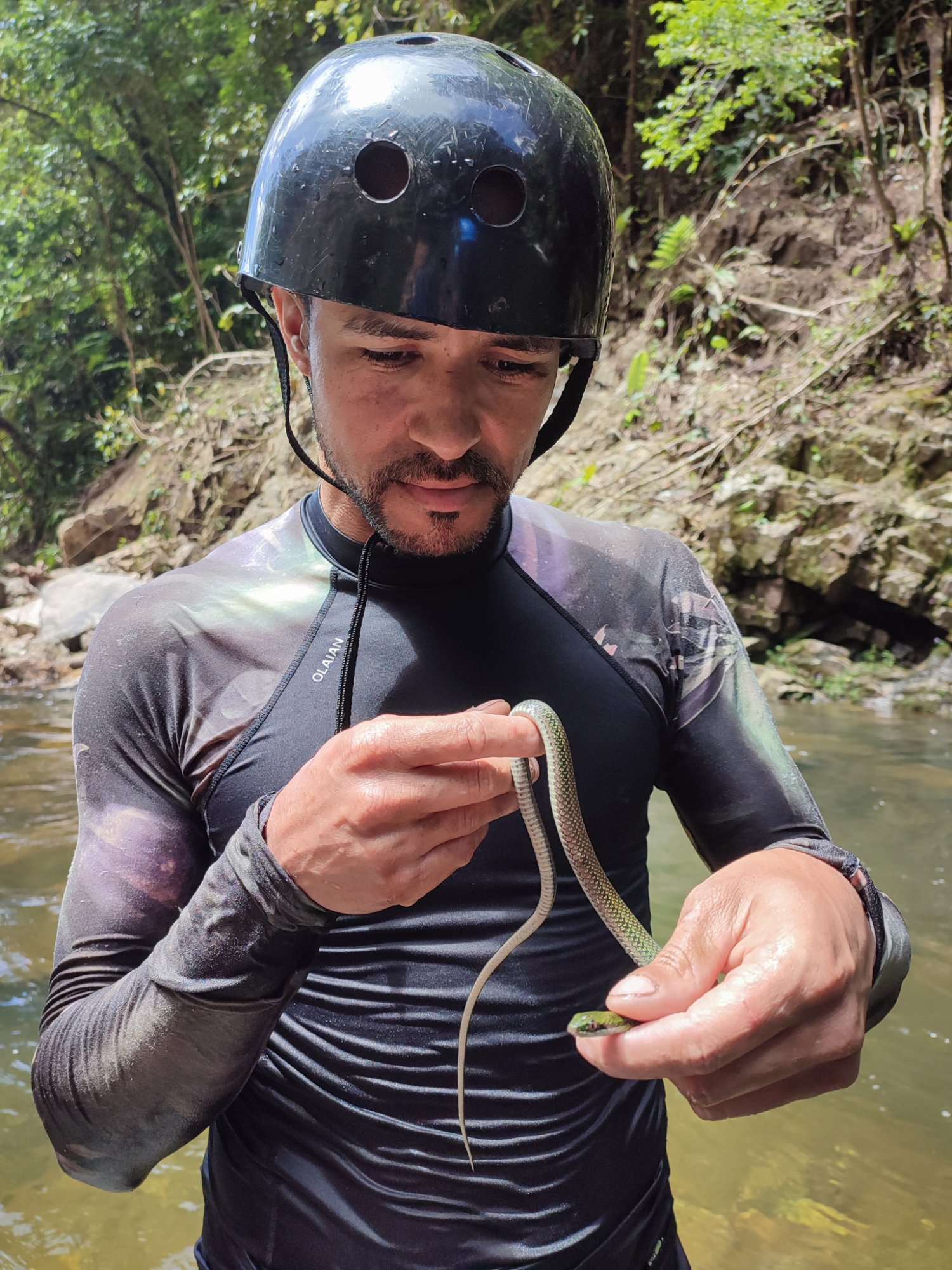 Com uma hora de avanço, depois de um pequeno toboágua natural, já caímos dentro de um poção gigante, sem menção de profundidade, de uma cor verde folha linda. Na beirada do toboágua o Ari encontrou uma cobra d'água, que veio dentro do poção junto com ele. Já em chão firme, com água na altura das coxas, paramos para apreciar aquela lindeza selvagem, que, a princípio, estava agitada mas se acalmou logo. Na hora de solta-la, meio que Instintivamente, foi direto ao encontro ao seu semelhante. Se enfiou entre as pernas do Kalidon tentando contato com a outra cobra. Rapaz deu um pulo kkkk.
