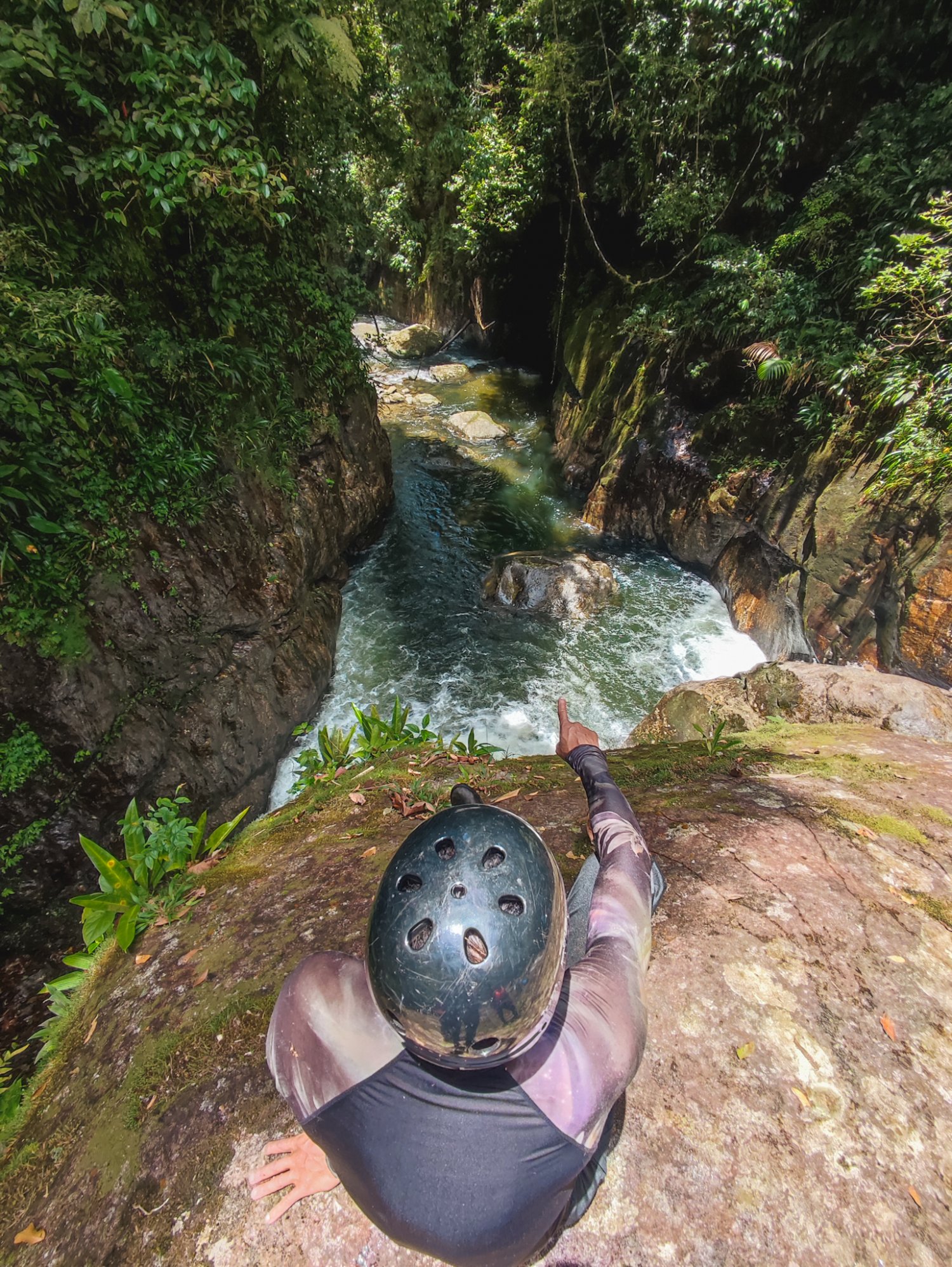 Sabíamos que era necessário o auxílio da corda. O David fez a instalação em uma árvore utilizando o sistema de resgate da mesma após o uso. Enquanto eu o Wellington o ajudava, com a certificação da segura na parte alta, Ari, com mochila estanque e colete salva vidas, foi o primeiro a saltar no poção que recebia uma forte correnteza vinda da direita formando um redemoinho do lado oposto. Eu não, pois estava voltado para cima, mas os amigos disseram que a água pressionou o Ari contra a parede e o redemoinho puxou ele três vezes para baixo. O pobre diabo já não tem força alguma, e é magro igual o "Senhor Madruga", ainda bem que usava colete. Mas não escapou de engolir água aos montes e ver sua mochila sendo levada pela água ("Ari, CÊ TOMA CUIDADO" kkk). Mesmo sendo numa cena rápida, o episódio abalou a estrutura do próximo a ir para o turbilhão: Tony.
