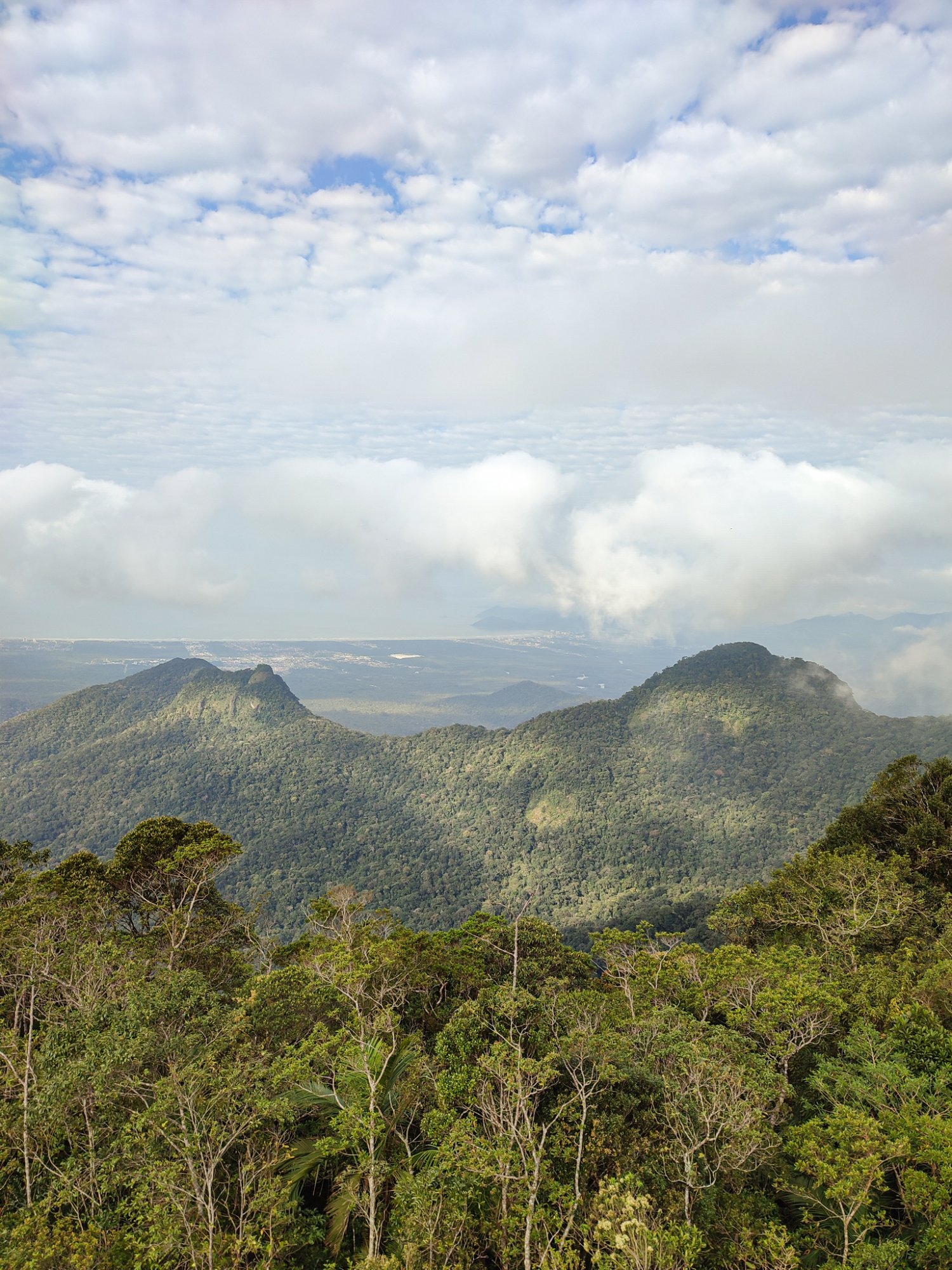 Na altura das copas das árvores, com um abismo abaixo de nós, pudemos ver todo o corte do vale dos Rios Guacá e Itapanhaú, a Mogi-Bertioga serpenteando aos pés da Serra, toda cadeia montanhosa estendida, e o sol se erguendo por detrás da Pedra da Boracéia. Foi lindo!