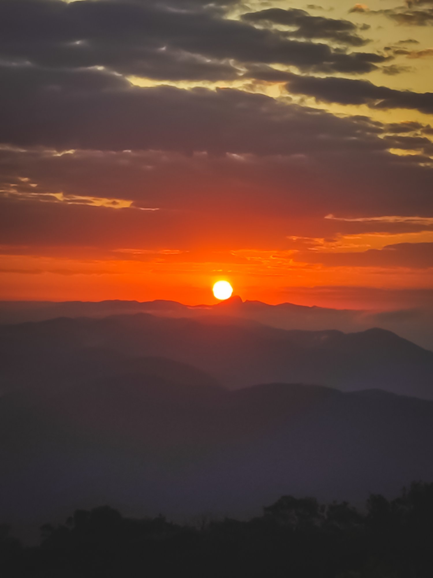 Antes de anoitecer um mar de nuvens invadiu o vão entre nós e o ombro da Serra. Quando o sol se pôs aquele tapete ficou incrivelmente lindo, bailando na escuridão. Imaginamos que ao amanhecer ele nos daria um espetaculo ímpar. Mas, para nossa tristeza, não foi assim. O sol ainda não tinha nascido, mas foi possível ver que as ondas de nuvens haviam se dissipado. Como não tem mirante para o leste tive que caçar alguma árvore forte e alta o bastante pra gente poder assistir o nascente.