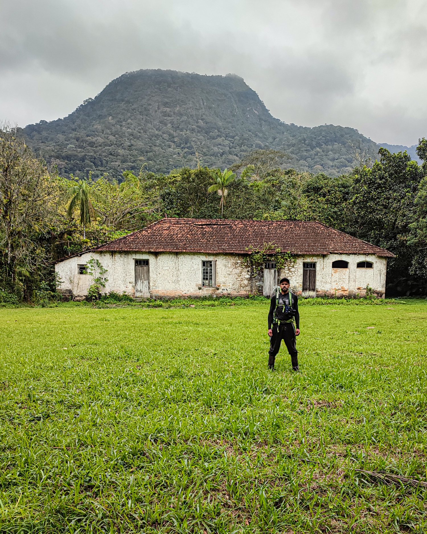 Já no celado novamente, nossa missão era despencar daqueles 500 metros de altitude rumo ao Itapanhaú o mais breve que pudéssemos. O vara mato se deu suave até chegarmos na nascente do riacho que queríamos 1h30 depois. Matamos nossa sede e seguimos em paralelo a ele até receber mais um riacho vindo da esquerda dando mais volume a ele. Perdemos altitude num piscar de olhos, e quando nos demos conta, já estávamos na cota 150, exatamente na confluência com o riacho principal que nasce próximo ao Tenente e desce formando poções com uma água cristalina de encher os olhos. Claro que teve um tibum para comemorar o nascimento de mais uma travessia selvagem ao mundo outdoor alternativo da Serra da Mar Paulista. Pois dali adiante já se iniciava o fim de nossa aventura. Vieram alguns poços para banho, e uma trilha marginal a direita do rio que nos levou até os fundos do Casarão do Sr. Nelson. Onde chegamos pisando fofo e, visto que ninguém mais habitava o lugar, pegamos algumas frutas aos pés e devoramos.
