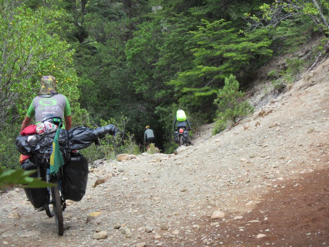 Iniciamos a pedalada ao meio dia, 16 km de terra + alguns de asfalto e chegamos em Lago Puelo, onde a idéia era pegar um barco/voadeira para atravessar de retorno a fronteira do chile. Mas não foi bem assim. O parque era pago (130 pesos/pessoa), para chegar em todos os atrativos do Parque precisava de barco, e esses barcos que estavam ali não levavam carga nem bike, somente pessoas/pedestres. Nem para os atrativos e muito menos para atravessar para o Chile, rs. O jeito foi voltar ao Chile de trilha mesmo... seria um Bônus: aproximadamente 33 kms de Single Track fechado e cascudo por um caminho antigo que os moradores faziam para chegar na cidade. A pé seria passeio no bosque, com a bike leve também. Mas com as bikes carregadas era complicado porque a trilha era estreita e a bike travava em qualquer obstáculo. Voltamos 5 kms atrás para entrar na trilha sem necessidade de pagar a taxa do parque. A estradinha seguiu suave por 12 km de terra ate a passarela. Pausa de almoço na beira do rio e a partir daqui entramos em terras Mapuches as 17hs... não sabíamos, mas levamos 3 dias para sair dali, rsrsrs. Levamos mantimentos suficientes para estes 3 dias Plus de perrengue supremo. O single track inicia bem aberto, sinalizado e demarcado. Totalmente pedal Avel e por 4 kms seguidos foi bem legal, sem necessidade de descer da bike. Depois veio uma longa subida de pedregulhos que precisamos empurrar as bikes. No topo voltamos a pedalar, mas sempre entalando os alforjes, enroscando o guidão, dando cabeçada em galhos, pedivela em troncos, canaletas no cambio, capacitada em arvores, derrapada em pedras, etc. A descida foi ora pedalando, ora empurrando. Um bom trecho levei a bici no ombro pra agilizar a descida. A bicicleta da Viviane é a que mais sofreu aqui e a que mais exigiu esforço também claro, pois como ela esta na estrada a 1 ano, seus alforjes sao enormes, os dianteiros estavam carregados tanto quanto o traseiro, além de 1 violão em sua bagagem (?!) rsrsrs. Tentamos nos revezar para ajuda-la nesta árdua tarefa de subir. Nos trechos mais críticos precisávamos de 2 ou 3 pra levantar a bicicleta dela... na descida todo santo ajuda, rs, e a criatura tem sangue mapuche, deu conta do recado, da subida/carregar/descer com um sorrisão na cara de quem tá adorando a ralação toda. Confesso: Também me diverti horrores em algumas situações, e algumas discórdias rolaram, rs. O trecho é curto mas levamos horassssss com as bikes entaladas, kkk. Foram 5,5 kms de single e depois mais 4,5 km de single mais fechado e menos sinalizado após a porteira até a Guendarmeria. Chegamos as 21hs. O dia foi exigente, dureza, mas bem agradável pois boa parte da trilha foi “pedalável”, principalmente o topo e as descidas finais. E gosto bastante deste tipo de terreno. O Fabio desceu tudo montado, eu não arrisquei ... não dava pra mim, rs, e na parte mais técnica empurrei. Acampamos na Guendarmeria ao lado da base de fronteira, sem estrutura nenhuma... apenas umas mesinhas que eles deixam para uso de visitantes.