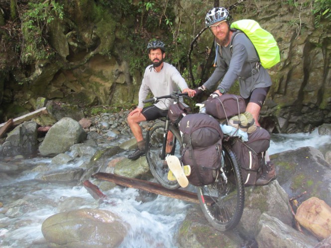 Mais um dia inteiro de single track em meio a mata fechada com bambu enroscando na bicicleta, tronco fechando a trilha, agua descendo pela montanha e poucos trechos pedaláveis... mas bem melhores que os de ontem. Nem se compara. Fomos bem devagar, com cautela. Um ajudando o outro, como realmente deve ser um grupo, ora um ajudando mais, ora menos, de acordo com a necessidade e com a reciprocidade... claro... afinal, estávamos todos no mesmo barco. Tínhamos que atravessar um rio com forte correnteza. Então desmontamos as bikes e fomos passando aos poucos, uma a uma, bagagem por bagagem, uma bicicleta de cada vez. A Meire foi a primeira a se jogar na água com boa carga de bagagem, e sem medo de agua fria deixou tudo do outro lado e voltou pra buscar mais... Tem meu total respeito e admiração !!! kkk. Eu não me molhei, rs, sinto muito frrrrio e não escondo de ninguém que não curto agua tão fria, kkkk, rs, então passei por cima de um troco/ponte lisa que atravessava para o outro lado um pouco mais acima, mas em caso de escorregar o machucado e o tombo seriam bem maiores, rsrs. Depois vieram outros 3 rios de aguas claras e cristalinas, mas com menor volume. A partir dali a trilha foi alargando cada vez mais, e ficando mais espaçada para passarmos pedalando. Fizemos uma parada para almoço em uma linda prainha e 1 km antes de chegar aos carabineiros paramos em 1 curral e montamos nosso acampamento. O Bruno foi ate o Carabineiro para saber sobre os tramites de entrada no Chile, e foi informado que para sair dali ainda precisaríamos de um barco... ouuu + 2 ou 3 dias de trilha mais fechada q esta, rs. Os Carabineiros também exigiram que a gente passasse um rádio ao achar o proprietário das terras permitindo nosso acampamento. Meire e Getúlio cumpriram a missão com louvor, acharam os proprietários e o radio foi passado. Tudo ok. A noite mais 2 ciclistas apareceram no caminho, aparentemente muuuuito cansados e sem comida pois não entendi se não estavam preparados para o trecho mais longo ou se deixaram cair no rio a bolsa com comida...