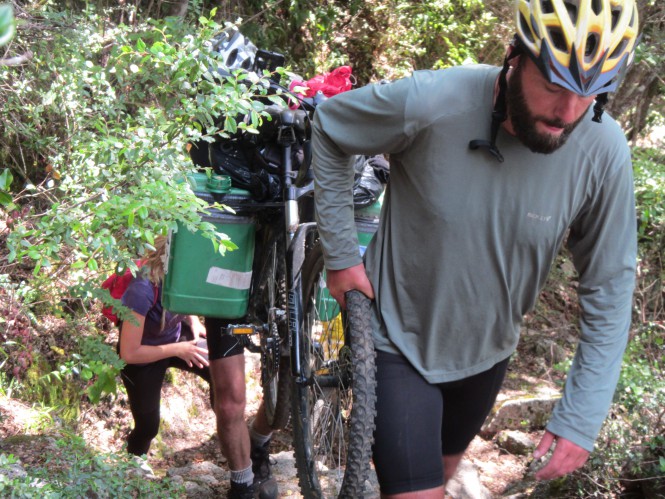 Dia de pouca quilometragem e muito suor. Dia duro, duro mesmo, de empurra empurra morro acima com as bikes pesadas. Dia todo de single track curto, mas bem exigente com tantos alforjes. Pouquíssimos trechos pedaláveis, muita arvore caída e muitos obstáculos no percurso. Subidas íngremes de pedra para empurrar as bicicletas e também trechos com lama escorregadia. Canaletas estreitas que entalavam a bike, além de cascalho e pedras soltas e lisas que escorregava com sapatilha de ciclismo, rsrsrs. Um verdadeiro parque de diversões em busca do perrengue supremo como dizia o Getúlio a todo momento, rsrs. Aqui neste trecho alguns dos integrantes já estavam bem cansados, desgastados, fora da zona de conforto e com o psicológico abalado de tanto tempo enfiado no mato, rs, mas não tinha jeito, todos precisam engolir choro e tocar pra cima... tínhamos que seguir em frente, e rápido... para sair deste trecho ate o dia seguinte antes que nossos mantimentos se acabem... O dia de hoje foi curtíssimo, mas foi o dia que botou a prova o preparo físico e o bom humor (ou a falta dele, rsrsrs) de cada um de nós, hahaha. Alguns com mais espírito de perrengue como o Getúlio que estava em busca do Perrengue Supremo, rsrs, outros com menos, alguns com bom espírito de equipe, outros com mais disposição pra ajudar, outros sem muita animação pra isso, outros com disposição pra resmungar, alguns com mais interesse em ser prestativo, alguns curtindo mais, outros desejando o fim daquilo e acho que pensando: o que eu tô fazendo aqui?!, kkk, mas pasmem: tinham alguns com espírito competitivo, kkk, Fabio estava correndo para ver se pegava uma boa colocação no Strava, hahahahaha, e eu triste porque minhas baterias reserva tinham acabado e nem conseguia marcar o caminho pelo celular, hahaha.... mas enfim, cada um curtiu (ou não) a sua maneira, e na minha opinião este trecho foi um bônus bem legal para a trip, e entre mortos, felizes e algumas discórdias, no geral, a todo momento existia alguém que derrubava suor pra ajudar o companheiro, a maioria se ajudava nos trechos mais íngremes e escorregadios, e aos poucos o grupo avançava ... mas a passos lentos, rsrs.