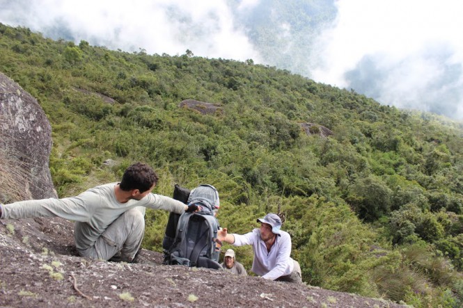 A trilha segue suave até aos 1.300 mts, depois disso a inclinação começa a ficar cada vez mais intensa. Neste trecho ela seguia bem demarcada até chegar em uma enorme formação rochosa no meio (cerca de 1.400 mts) e sumir totalmente. Demoramos uns 15 minutos para entender que a trilha só poderia seguir pelo lado esquerdo da rocha, mas tinha um trecho bem complicado de aderência, como as mochilas estavam pesadas, ninguém quis arriscar. O Simon tentou subir pela encosta mais ao lado e avistou uma corrente que ajudaria a subir aquele trecho exposto, como conseguimos subir pelo mesmo caminho que o Simon segurando nos cipós, não precisamos dela. Por volta do meio dia paramos para um breve lanche. O altímetro marcava 1.500 mts, nosso destino era a chegar em uma caverna a mais ou menos nos 2.000 mts.