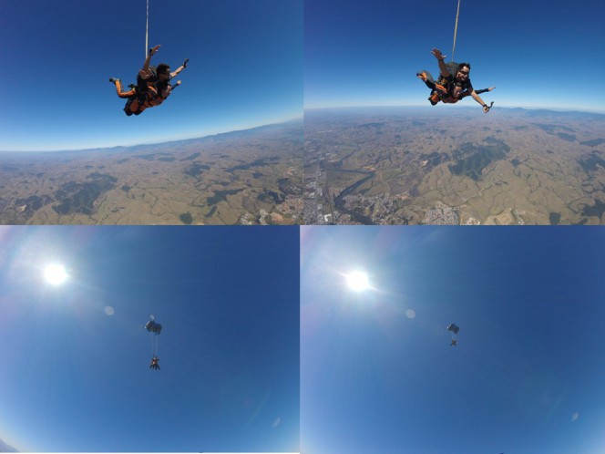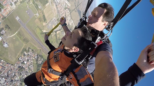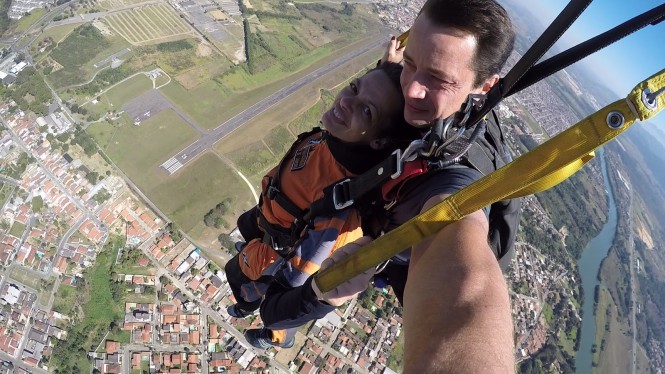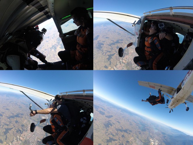 De cara para a vastidão do céu nem sabia onde estava meu câmera fly Gustavo. Estava tensa e Pato tocou na minha testa para que eu jogasse bem a cabeça para trás a fim de proteger meu pescoço na queda. De resto só sei que Pato projetou o corpo dele pra frente e eu estava rendida, totalmente à mercê dele, e meu corpo caiu junto no ar.Eu não consigo descrever a sensação. Ao mesmo tempo em que estava apavorada, estava em êxtase, porque é indescritível. “Quando eu saltar se você falar comigo e eu não responder não se preocupe, porque quando fico tensa, fico quietinha”, eu falara isso para Pato e foi exatamente o que aconteceu. Fiquei quietinha, mas olhando atentamente tudo ao meu redor e abaixo de mim. Conforme o treinamento, Pato bateu no meu ombro e eu pude então abrir os braços.