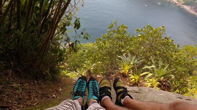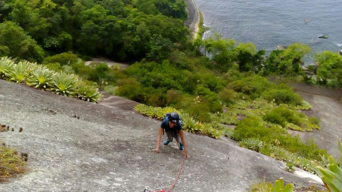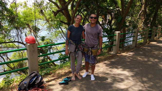 Ele confirmou nossa aventura na véspera, no final da tarde. E marcamos às 7:00am na entrada da Pista Cláudio Coutinho. Chegamos juntos, ambos atrasados 5 minutos eu tinha brincado com ele quando tinha dito que 7 da manhã era bem cedo e acabei me atrasando também. Não perdemos tempo, rumamos para a base do Coloridos e colocamos os equipamentos. Mas subimos sem corda até determinado trecho até chegar à base da escalada. Subi igual a um orangotango toda desengonçada, e Anderson filmando!