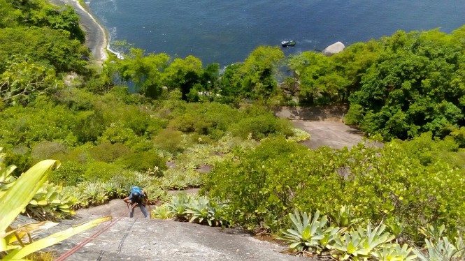 No trecho final, muito curtinho, estava sem forças e pedi para ser “rebocada”. Subi pela corda, mesmo, sob o olhar super compreensivo do Anderson. Havia pontos em que realmente devia ser apenas na aderência, chapar mãos e pés na pedra e erguer o corpo. Mas a sede e falta de preparo físico me impediram de fazê-lo e meu guia teve a sensibilidade de entender isso.