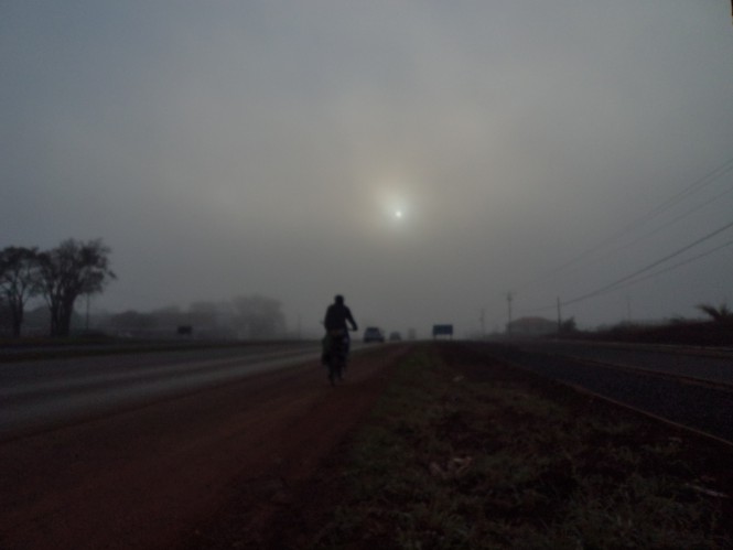 Acordo 6 horas, ajeito tudo, agraço aos bombeiros e saio. Passo na padaria para abastecer meu alforge e faço meu café da manhã numa praça da cidade. Termino e parto rumo a Maringá.